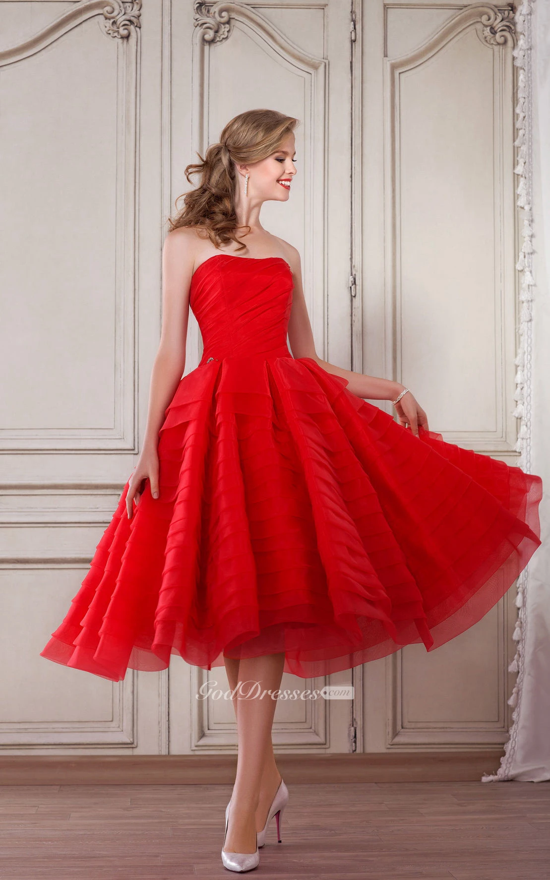 A-Line Tea-Length Strapless Sleeveless Organza Ruching Pleats Zipper Dress
