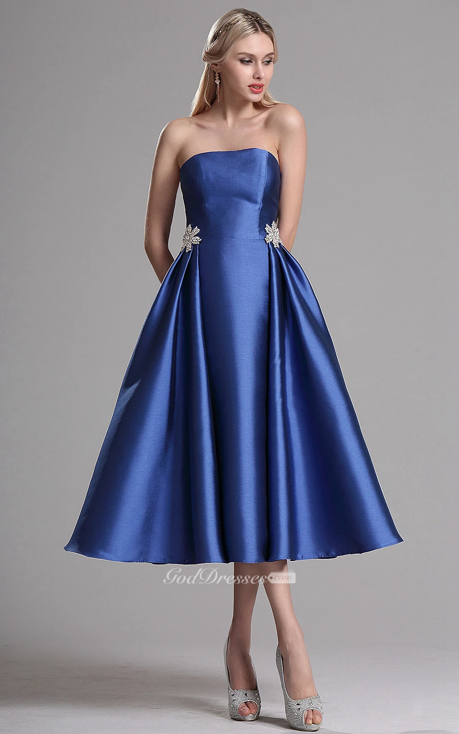 A-Line Tea-Length Strapless Sleeveless Satin Flower(S) Zipper Dress