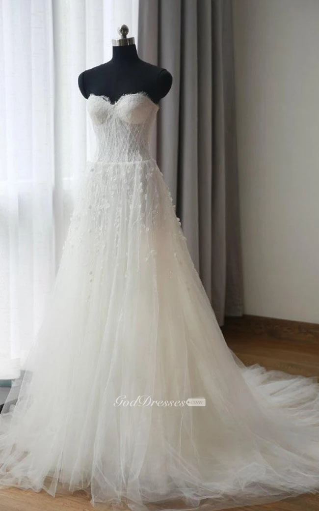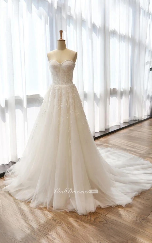 A-Line Tea-Length Sweetheart Sleeveless Bell Flower Zipper Keyhole Tulle Lace Satin Dress