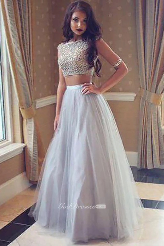 A-Line Two Piece Lace Tulle High Neck Short Sleeve Zipper Dress