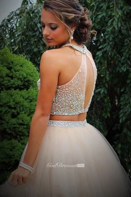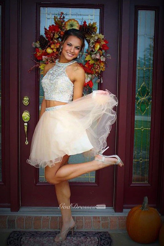 A-line Two Piece Sleeveless Organza Sequins Halter Keyhole Short Mini Homecoming Dress