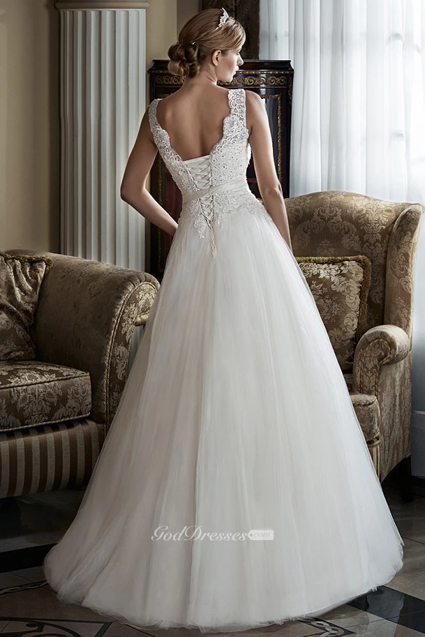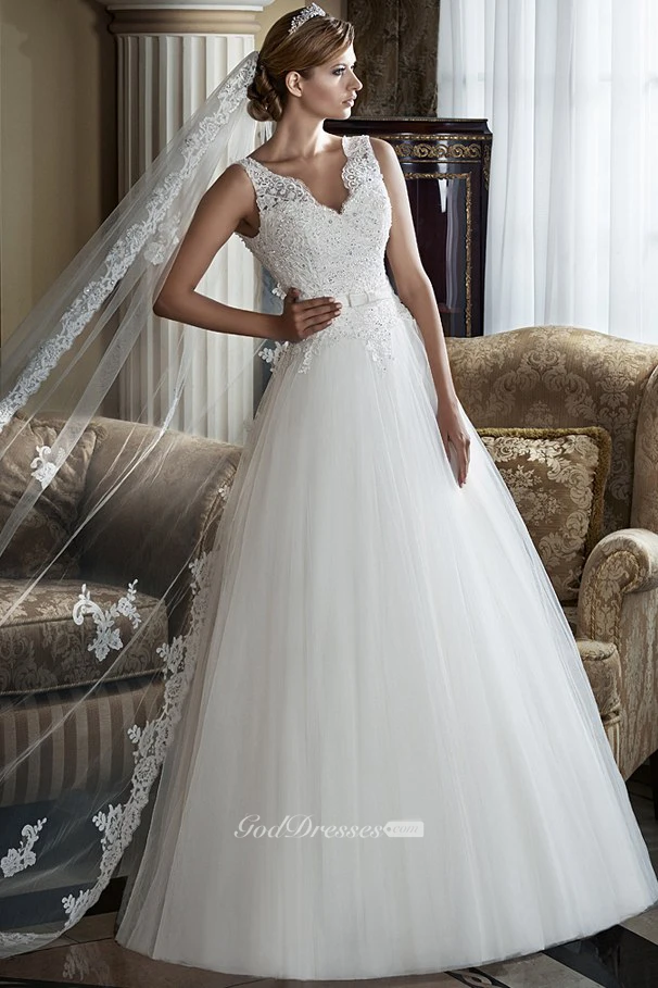 A-Line V-Neck Appliqued Long Sleeveless Tulle&Lace Wedding Dress