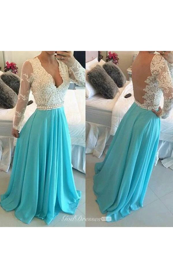 A-line V-neck Chiffon Long Sleeves Applique Sweep Train Dresses
