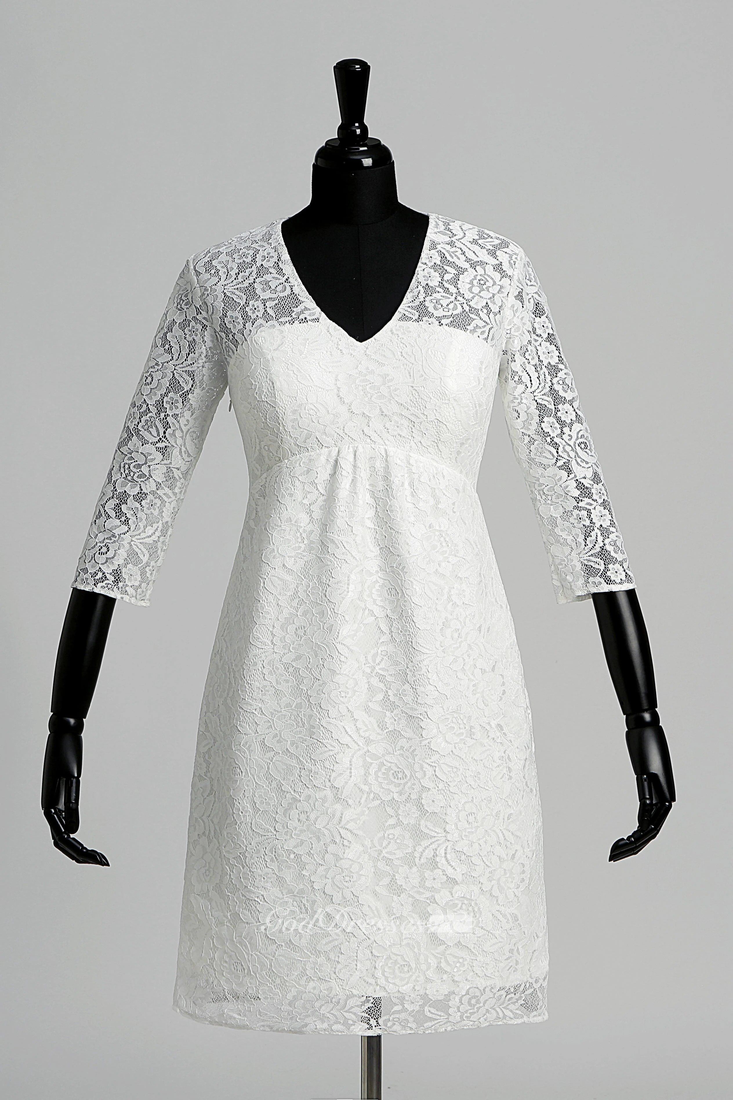 A-line V-neck Illusion 3/4 Length Sleeve Knee-length Lace Wedding Dress