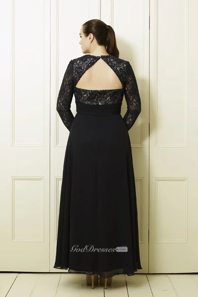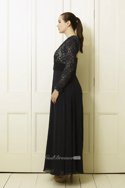 A-Line V-Neck Long-Sleeve Ankle-Length Lace&Chiffon Plus Size Prom Dress