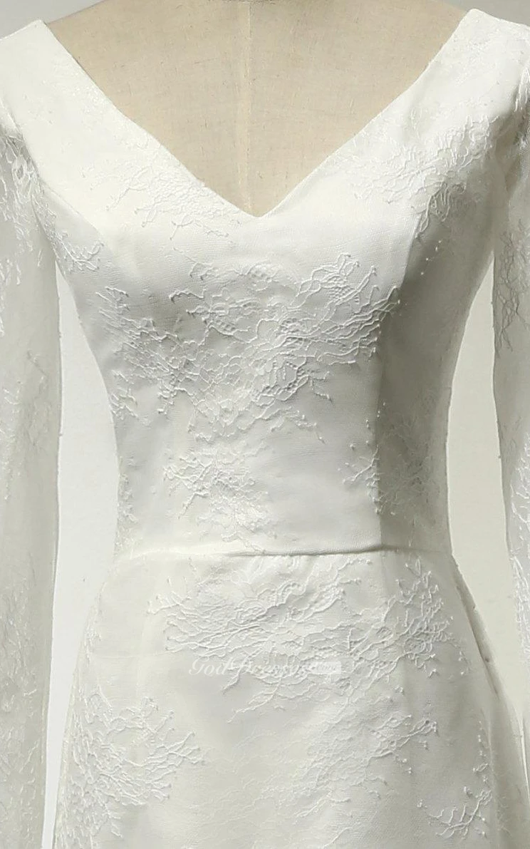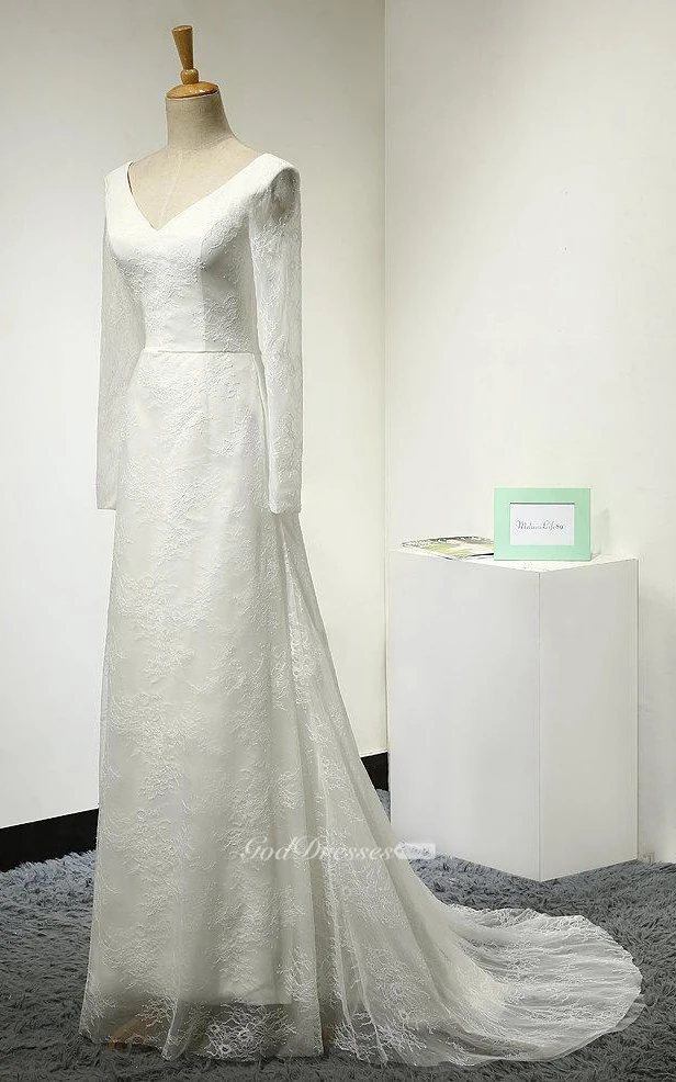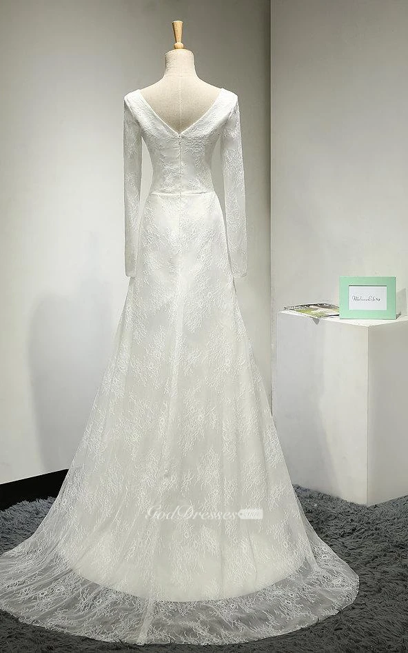 A-Line V-Neck Long Sleeve Court Train Tulle Lace Dress