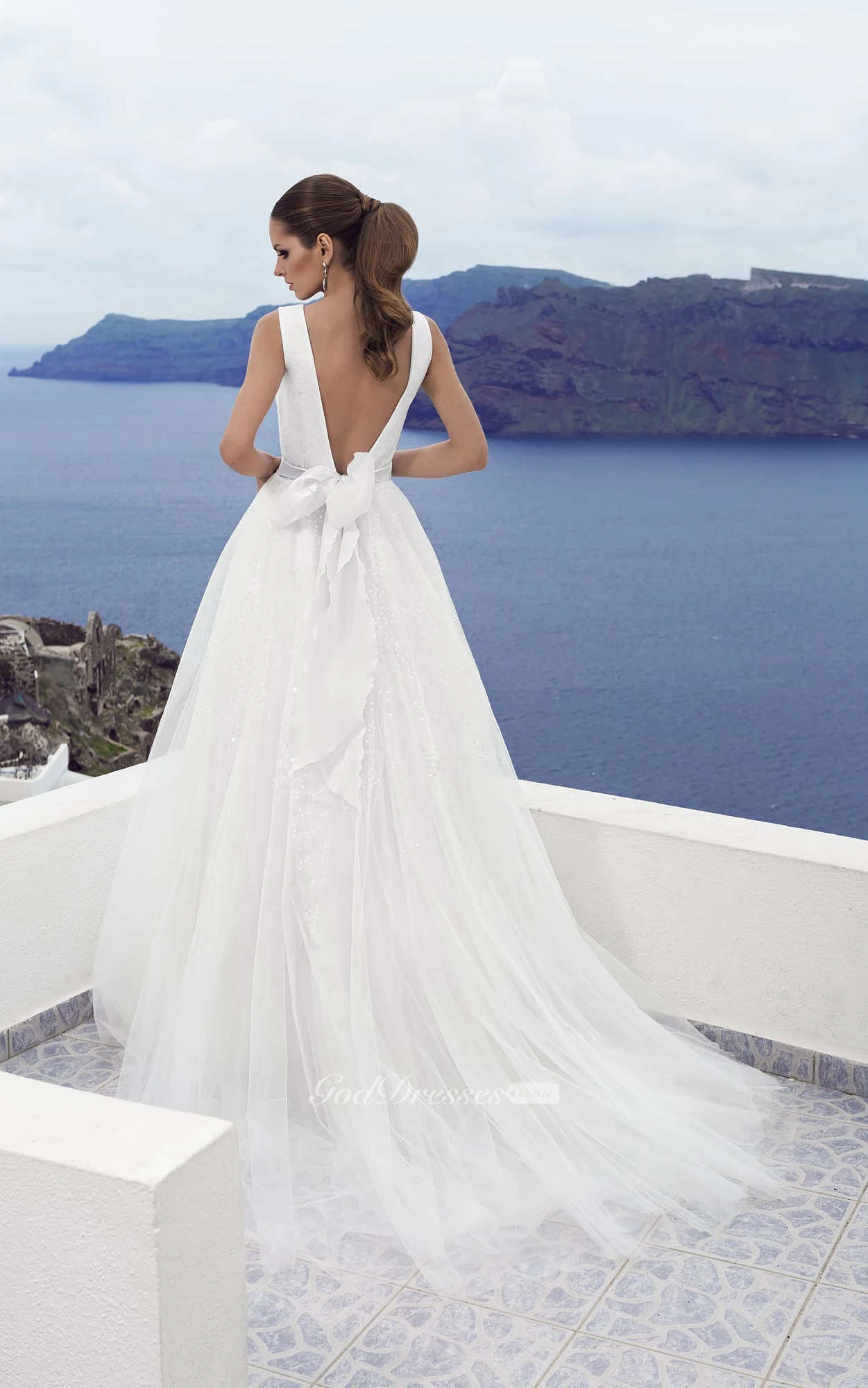 A-line V-neck Low-V Back Tulle Floor-length Dress With Bow&Sequins