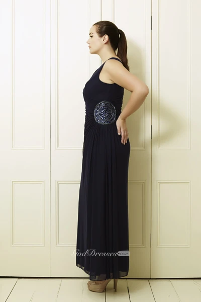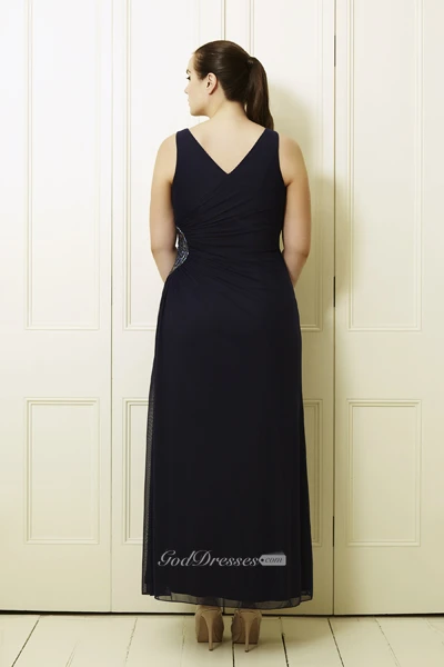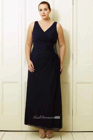 A-Line V-Neck Sleeveless Ankle-Length Side-Draped Chiffon Plus Size Prom Dress With Beading