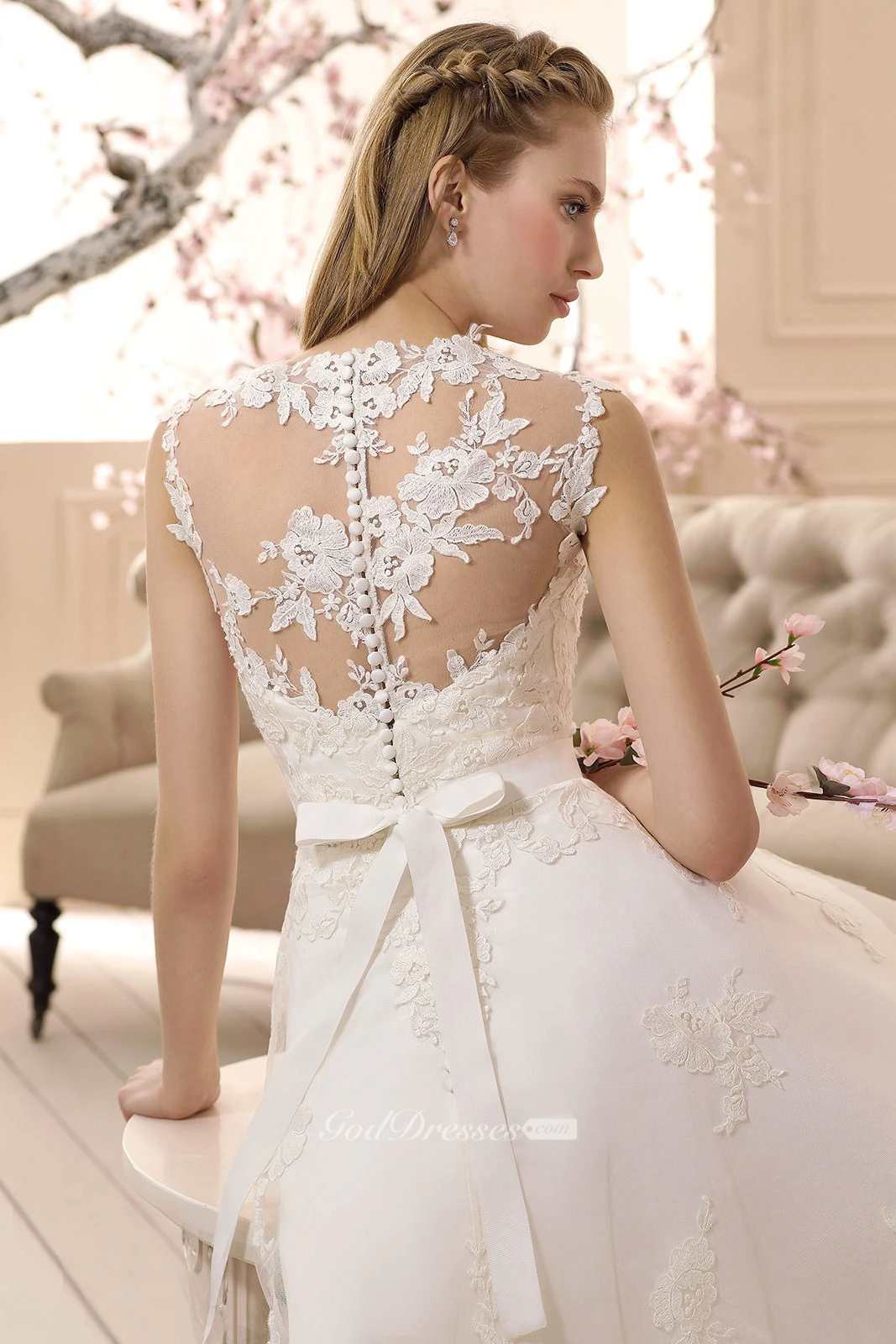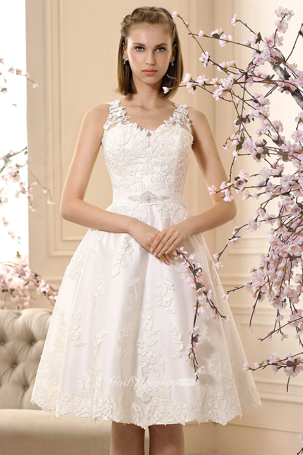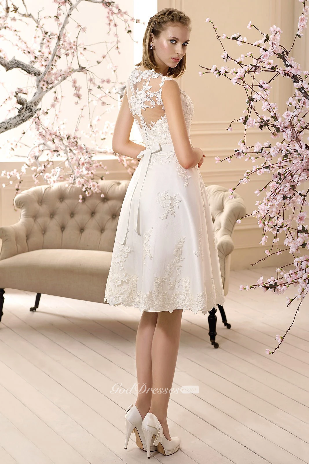 A-Line V-Neck Sleeveless Knee-Length Appliqued Lace Wedding Dress With Bow