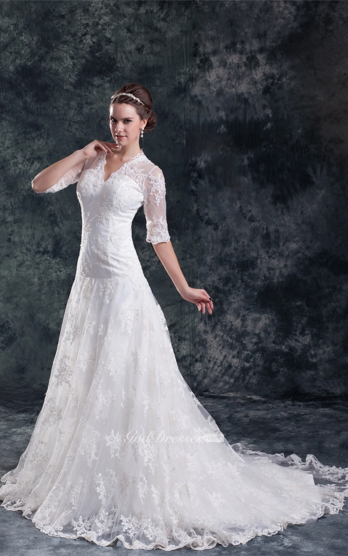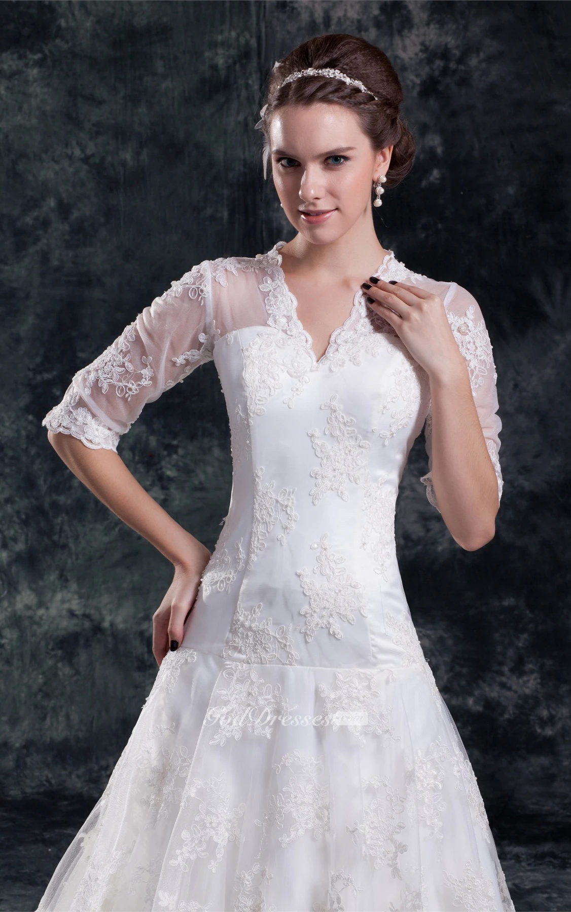 Adorable Satin Appliqued a Line V Neck Half Short Sleeve Wedding Dresses