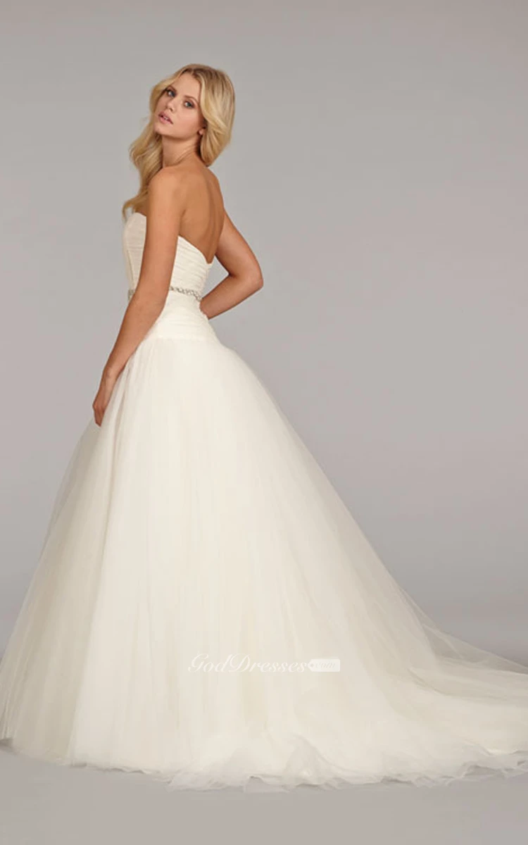 Tender tulle is gently ruched wrapping you into a tightly fitting sweetheart neckline strapless bodice of this incredible wedding gown down to the hips. Shimmering crystal beaded belt adorns the dress on the natural waistline the. Gorgeous full ball skirt forms a vapory cloud down to the feet with a magnificent chapel train behind.