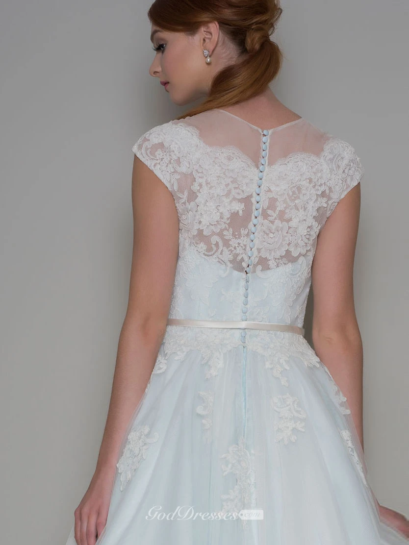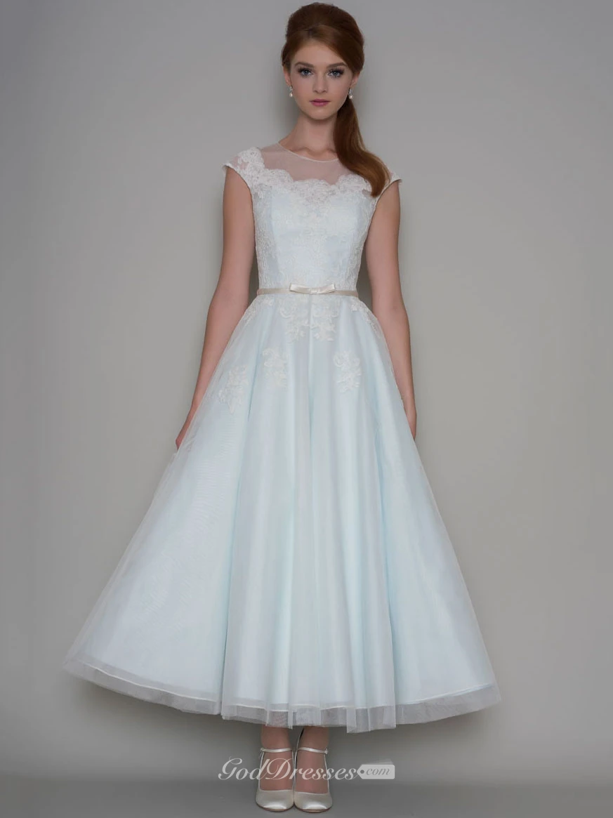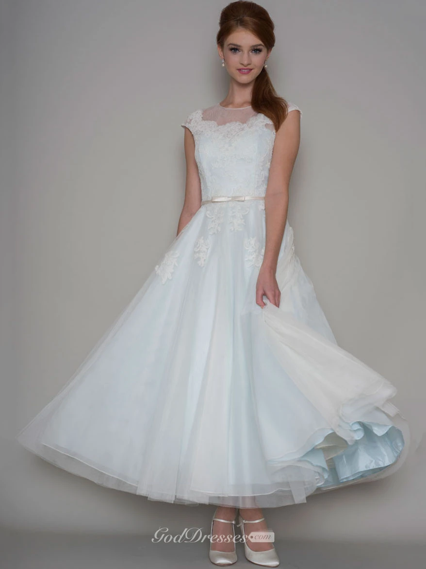 Ankle-Length A-Line Cap Sleeve Scoop Neck Appliqued Tulle Wedding Dress