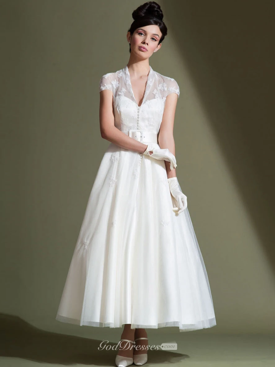 Ankle-Length A-Line V-Neck Cap Sleeve Appliqued Tulle Wedding Dress