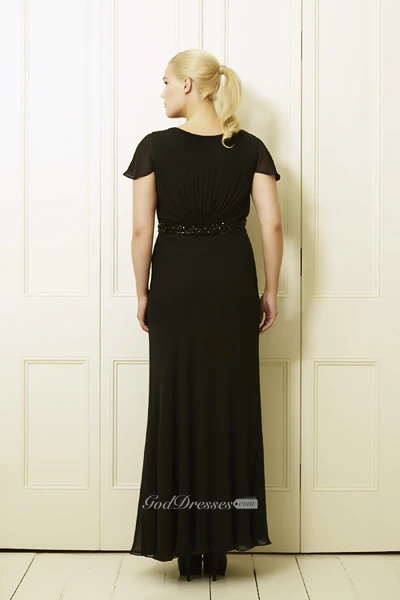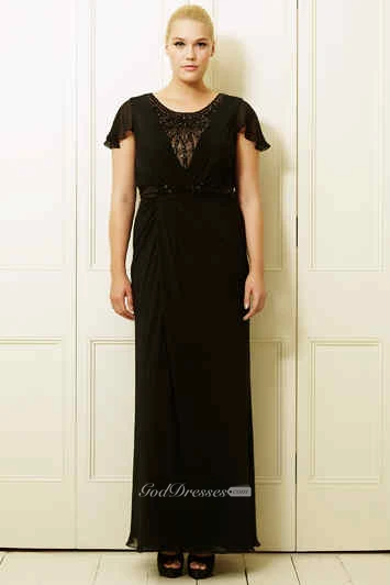 Ankle-Length Beaded Poet-Sleeve Scoop-Neck Chiffon Plus Size Prom Dress With Draping