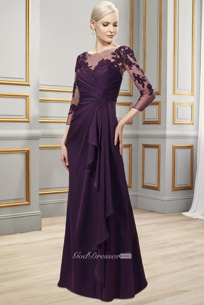 Appliqued Bateau Neck 3-4 Sleeve Chiffon Formal Dress