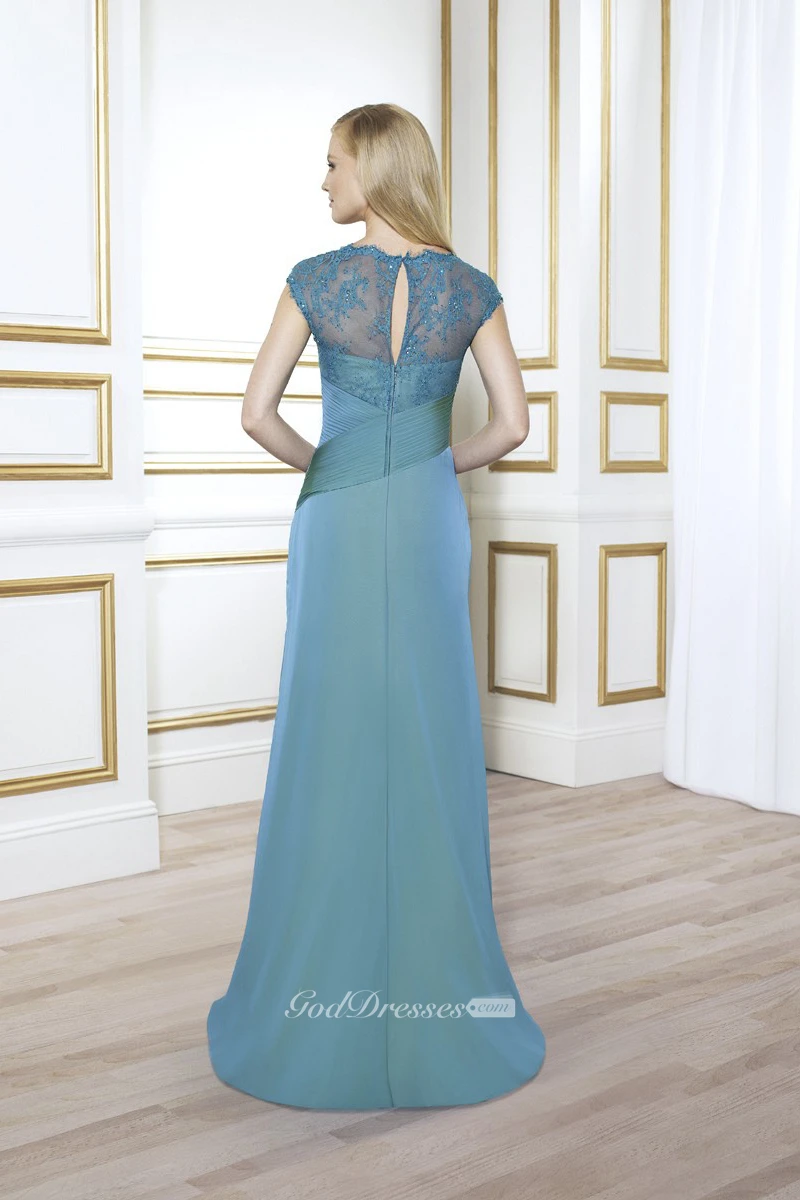 Appliqued Floor-Length Cap-Sleeve V-Neck Satin Formal Dress With Draping
