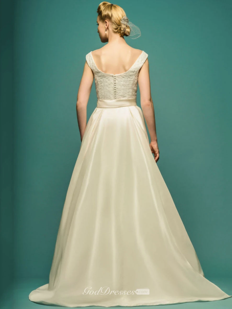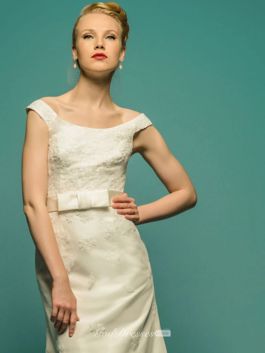 Appliqued Square-Neck Long Satin Wedding Dress With Bow