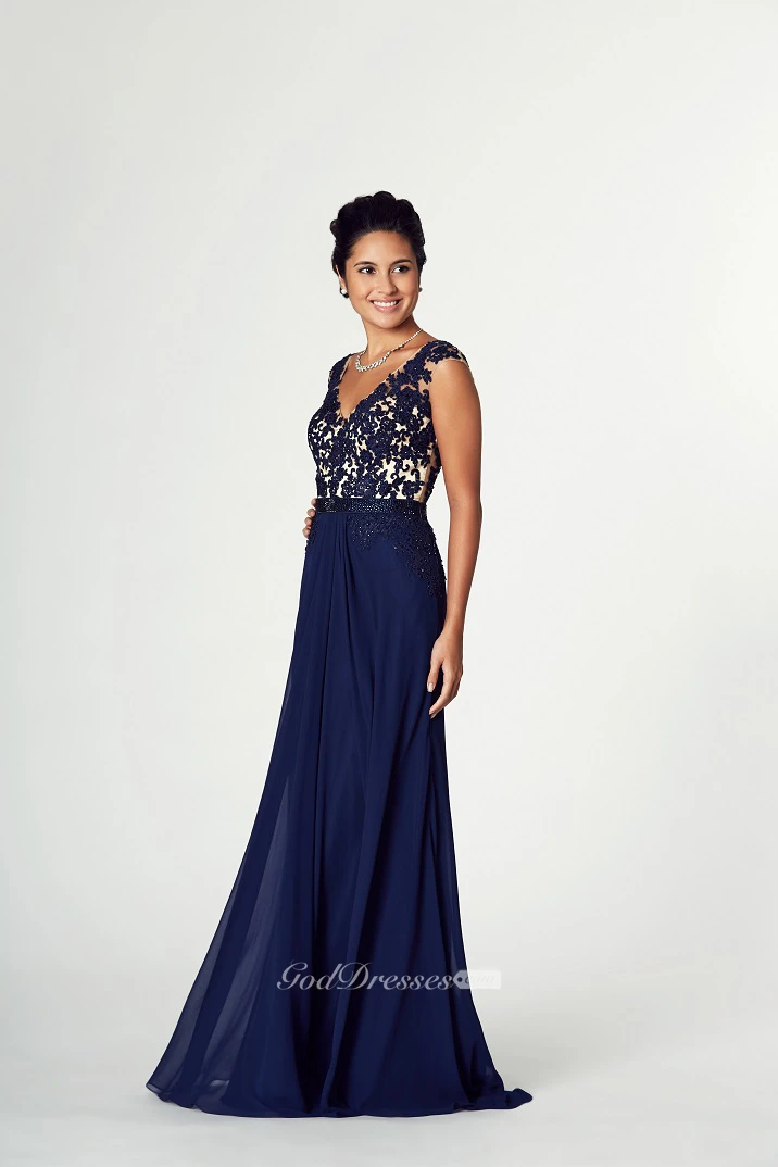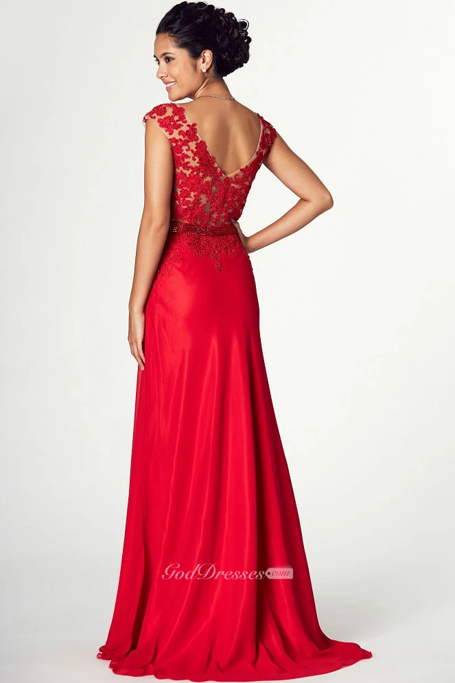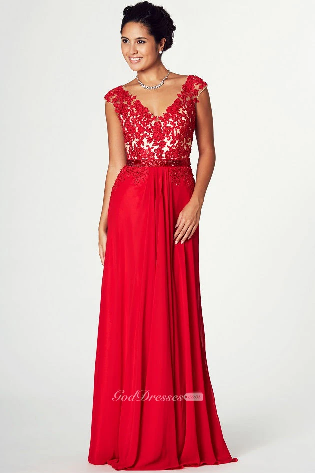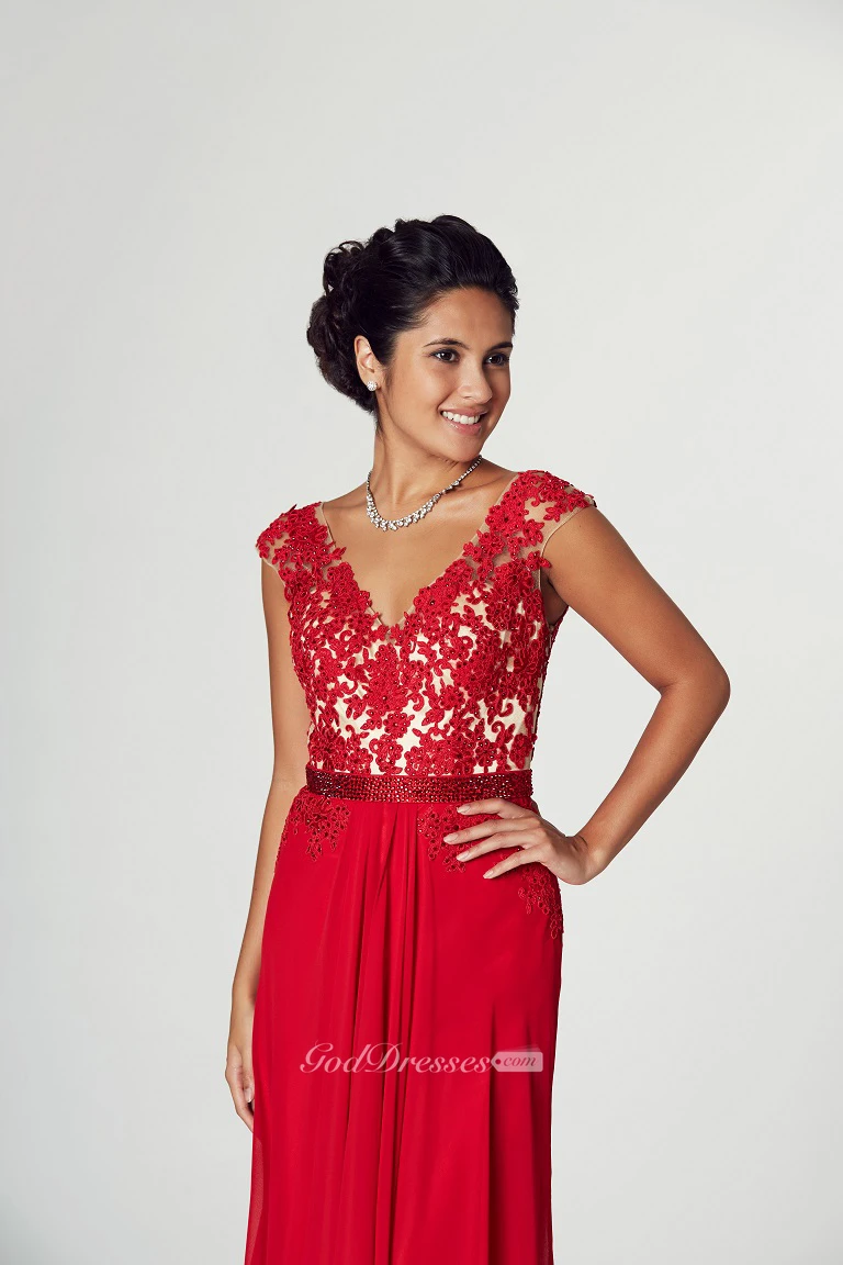 Appliqued V-Neck Cap Sleeve Jersey Prom Dress