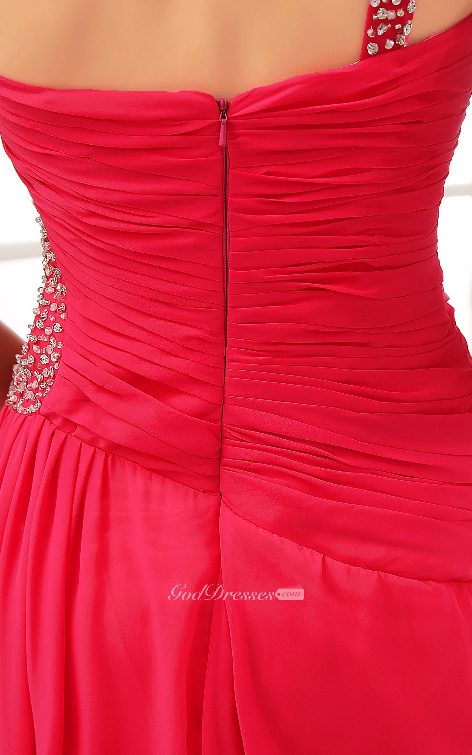 Asymmetrical Chiffon Maxi Dress With Criss-Cross Ruching and Beading