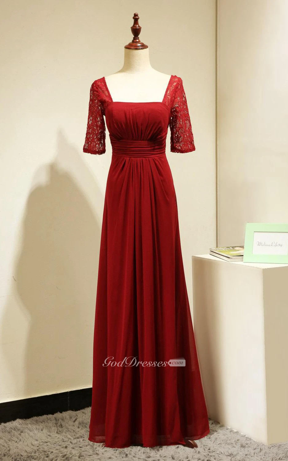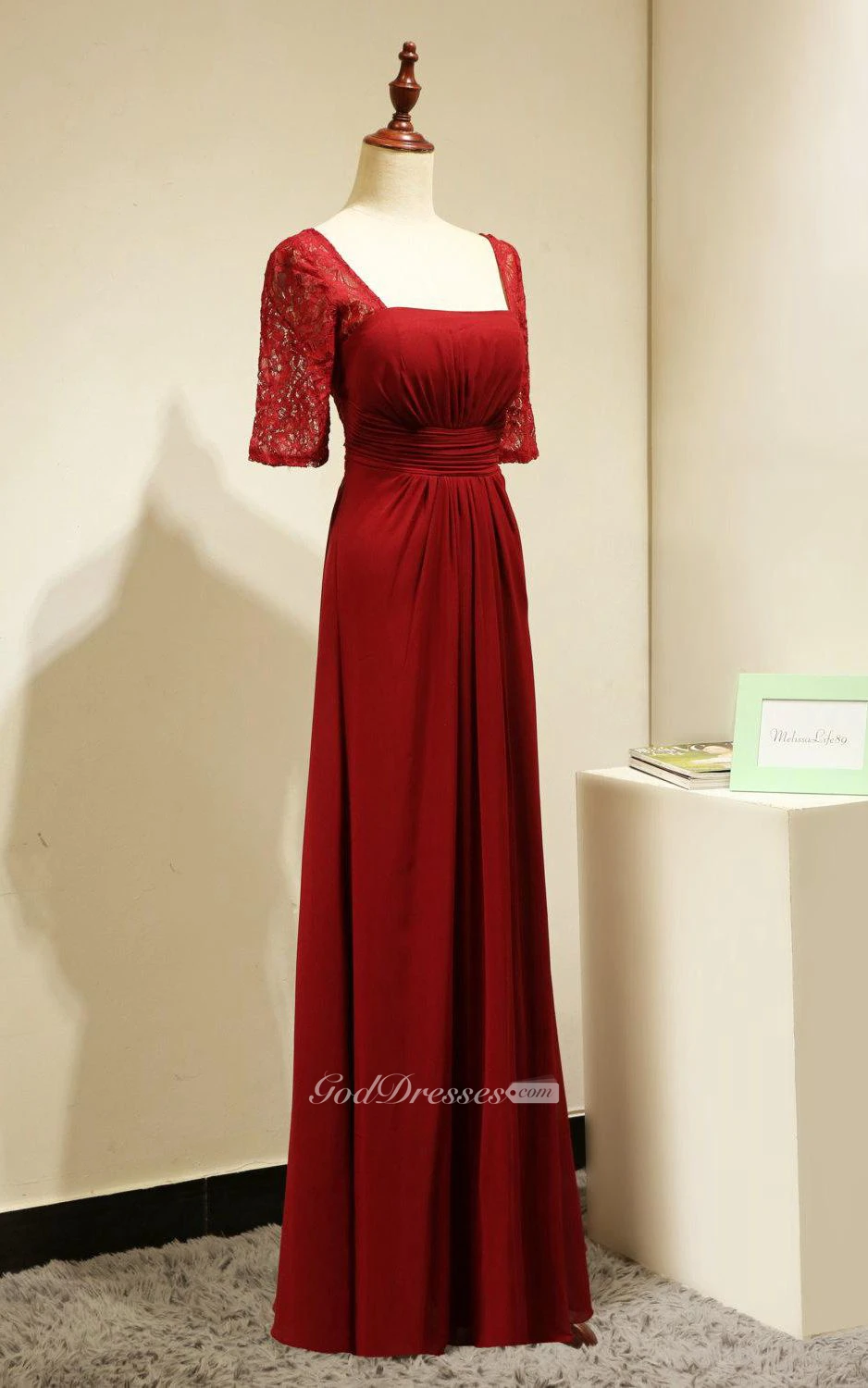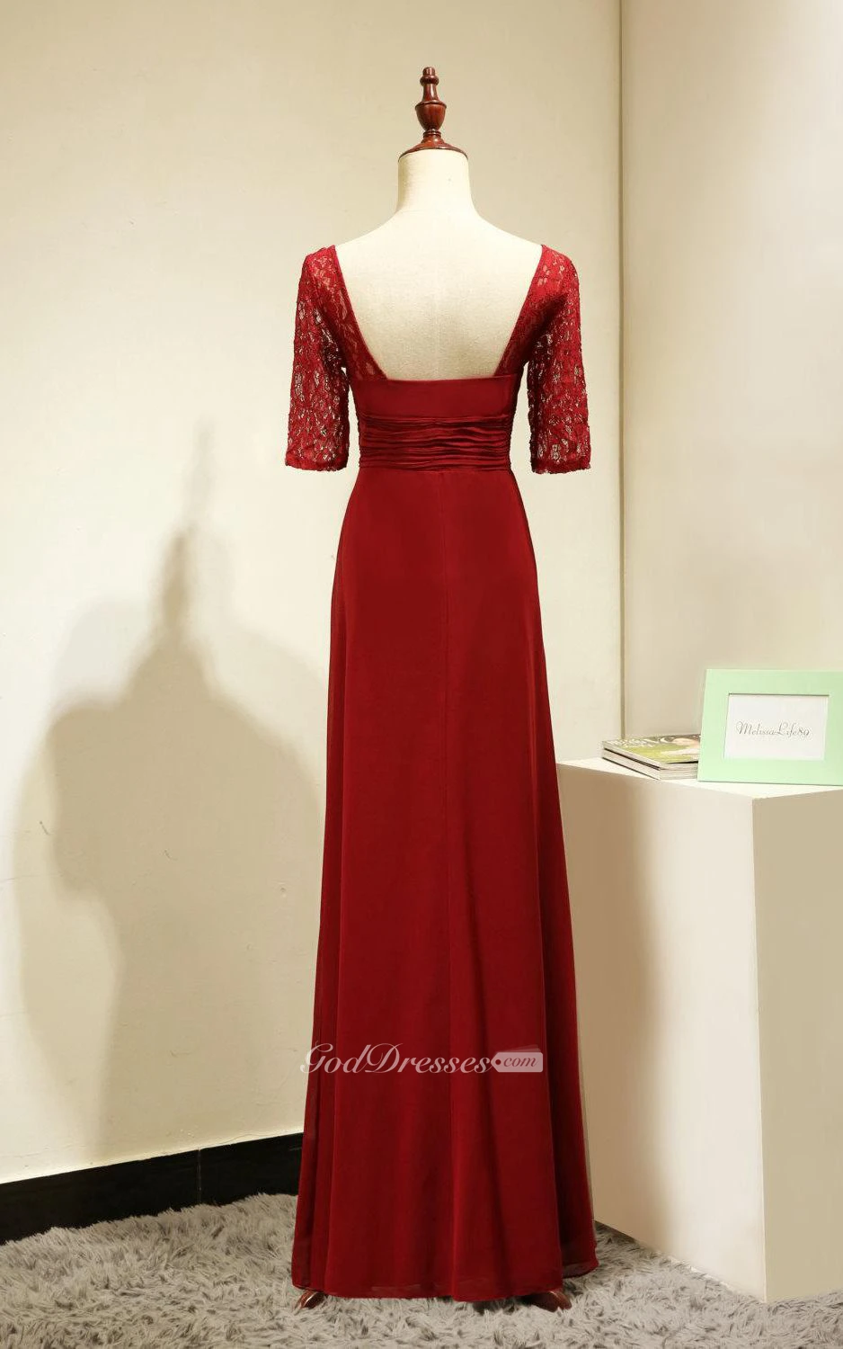 Backless Lace Half Sleeve Pleated A-line Chiffon Long Dress Red
