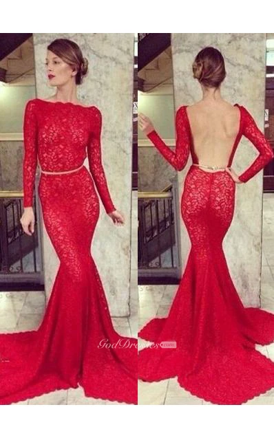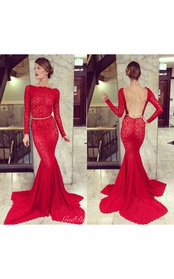 Backless Lace Mermaid Prom Dresses Bateau High Neck Long Sleeve Sheer Party Gowns With Court Train