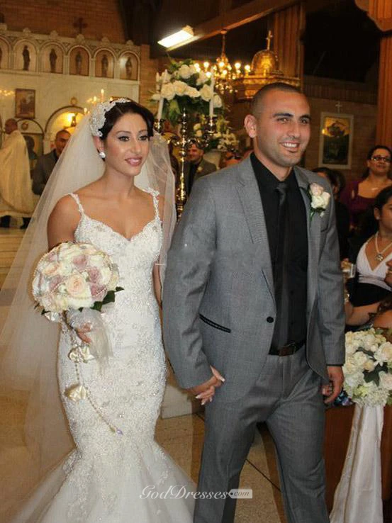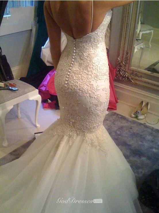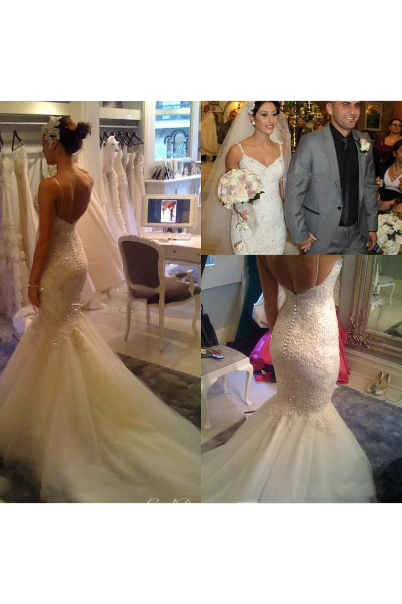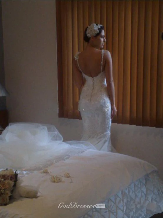Backless Sexy V Neck Beaded Spaghetti Straps Mermaid Lace Appliqued Bridal Gown