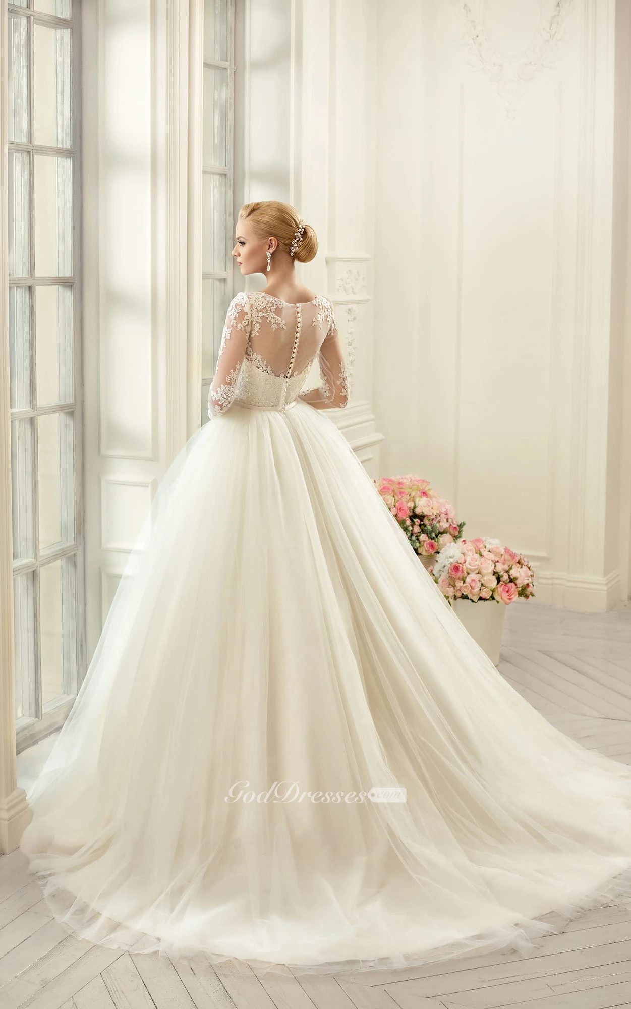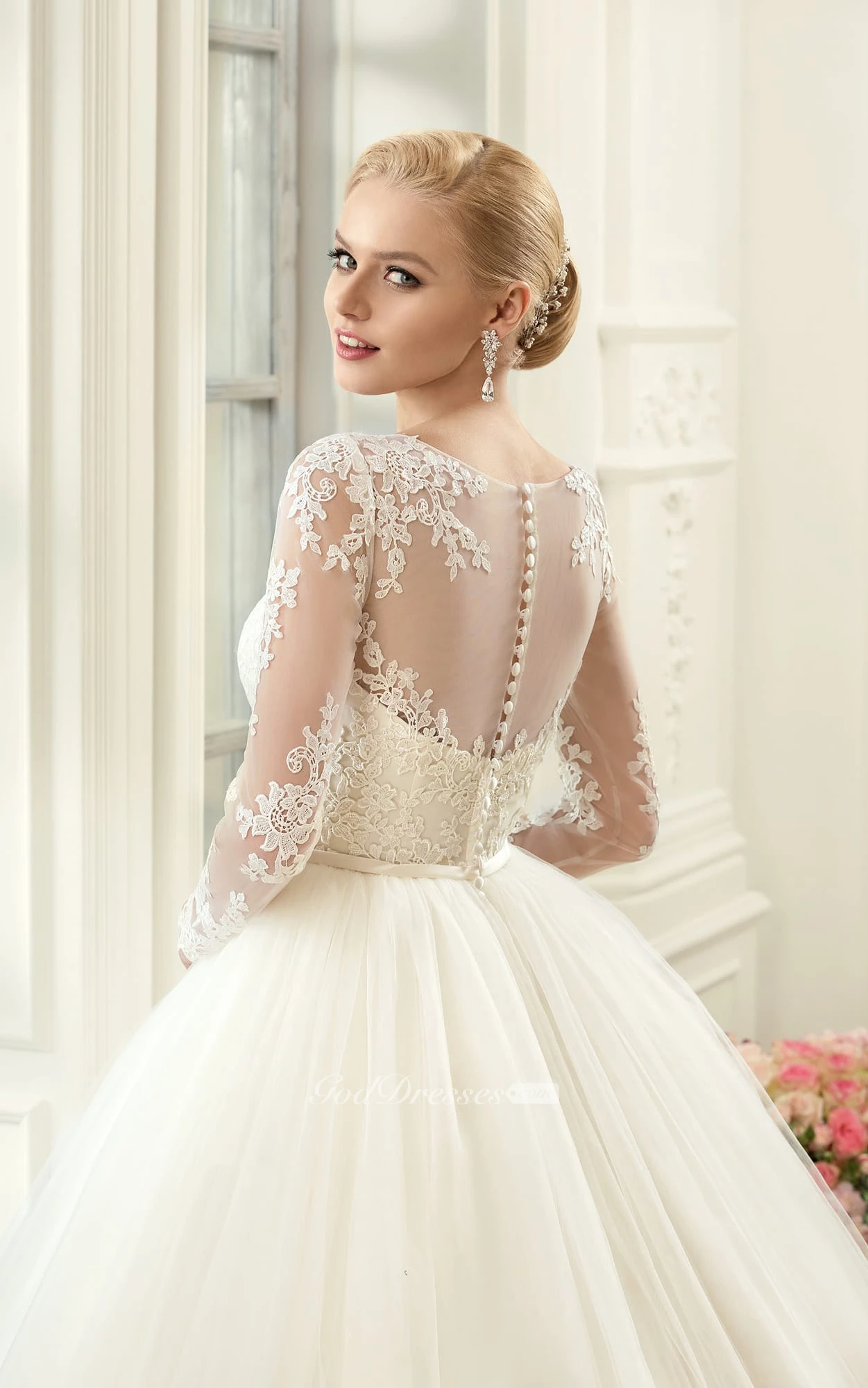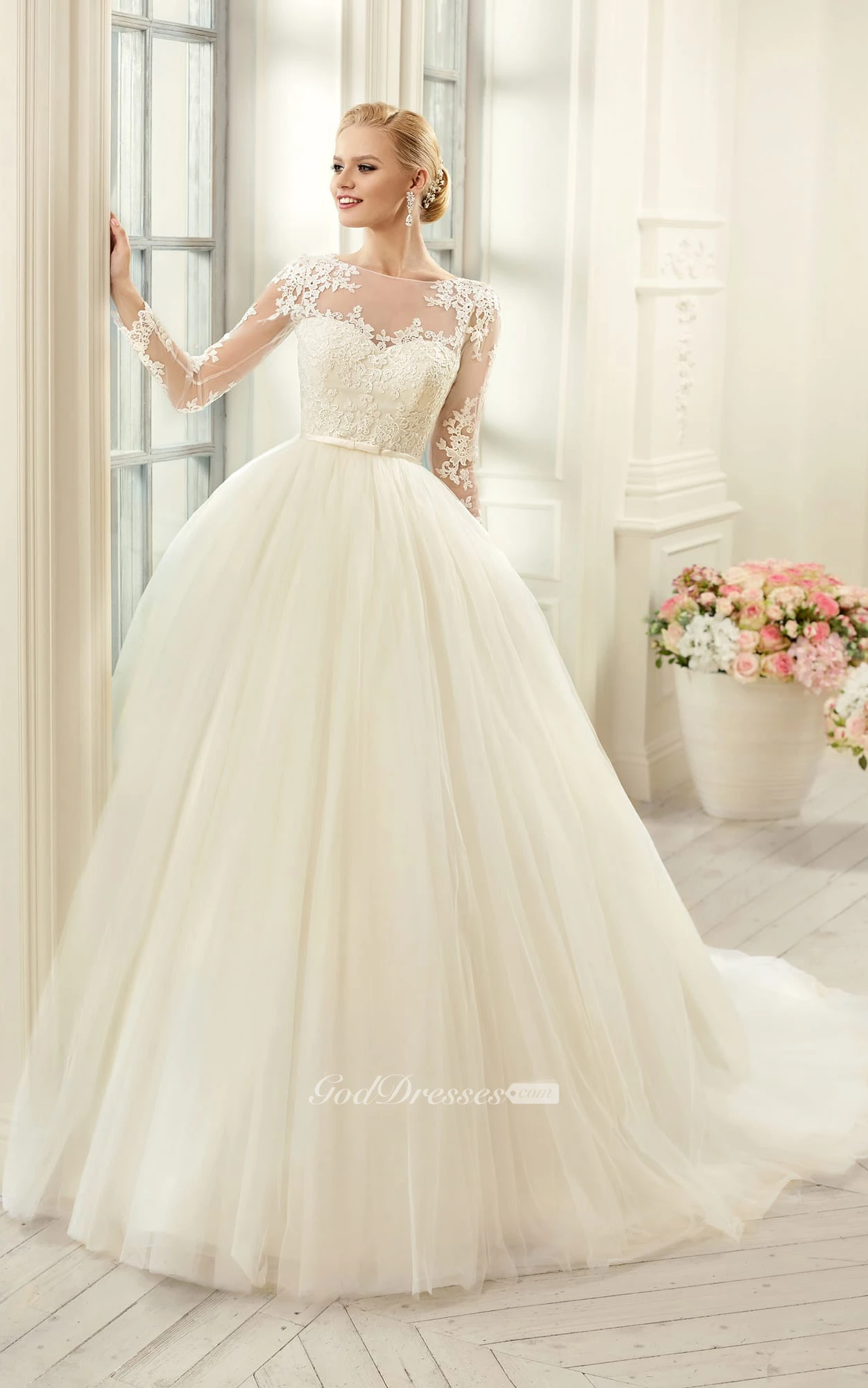 Ball Gown Floor-Length Jewel Long-Sleeve Illusion Tulle Lace Dress With Appliques