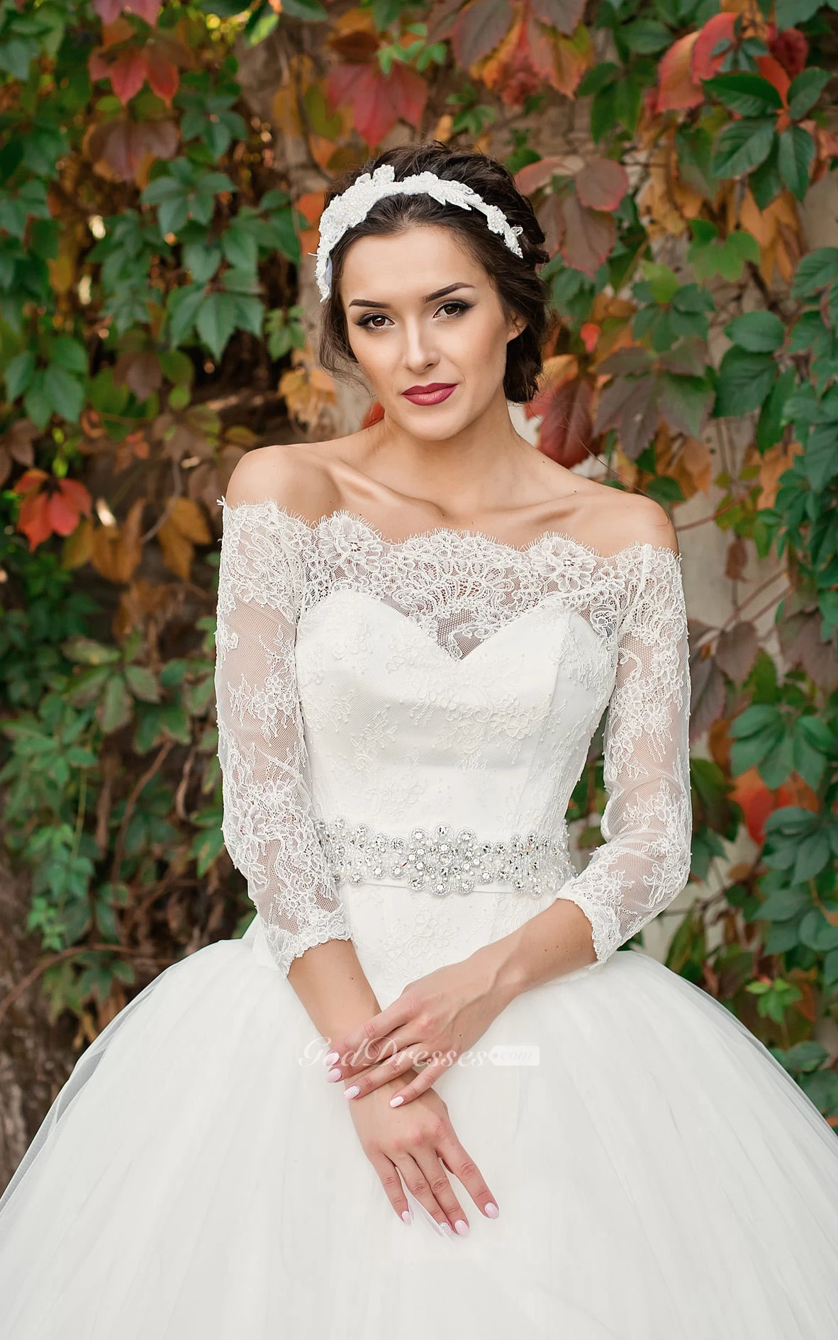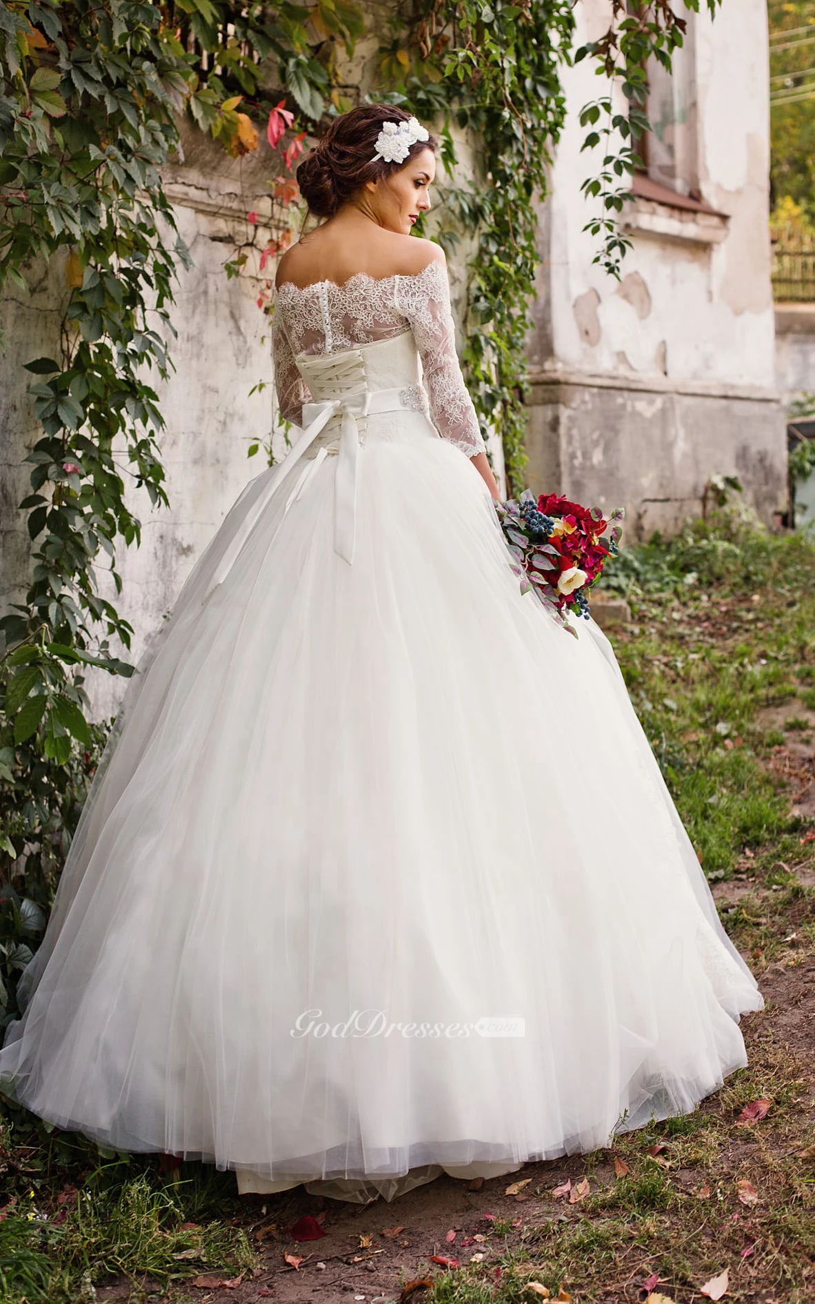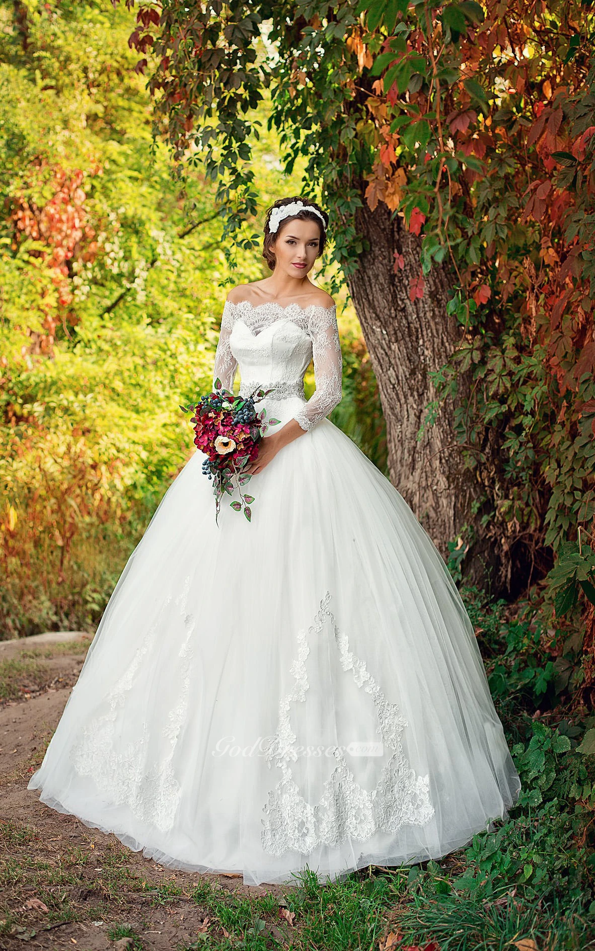 Ball Gown Floor-Length Off-The-Shoulder 3-4-Sleeve Illusion Lace Tulle Dress With Appliques And Beading