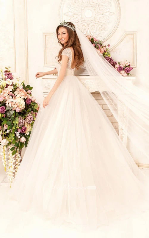 Ball Gown Floor-Length Scoop Cap-Sleeve Low-V-Back Tulle Dress With Appliques And Waist Jewellery