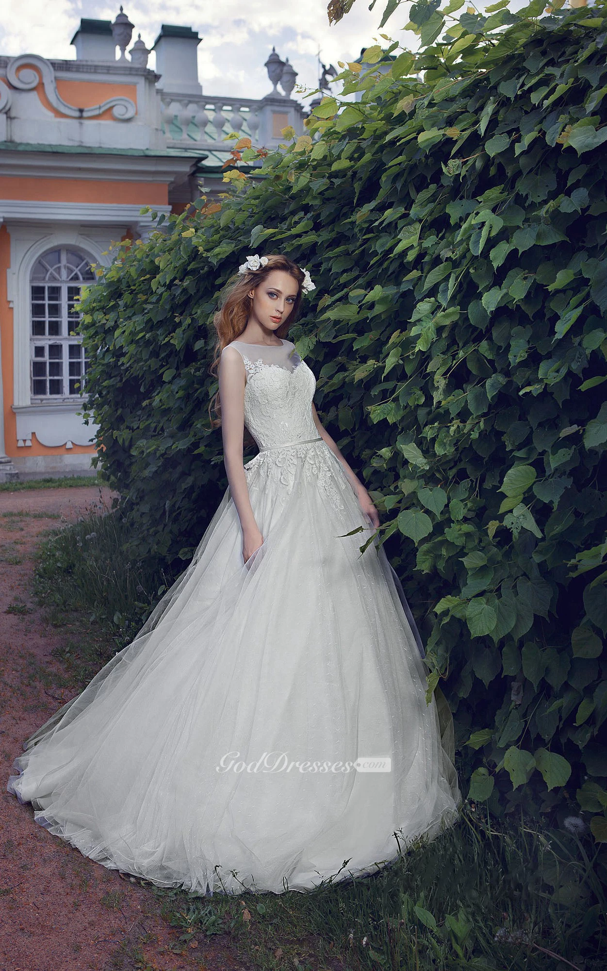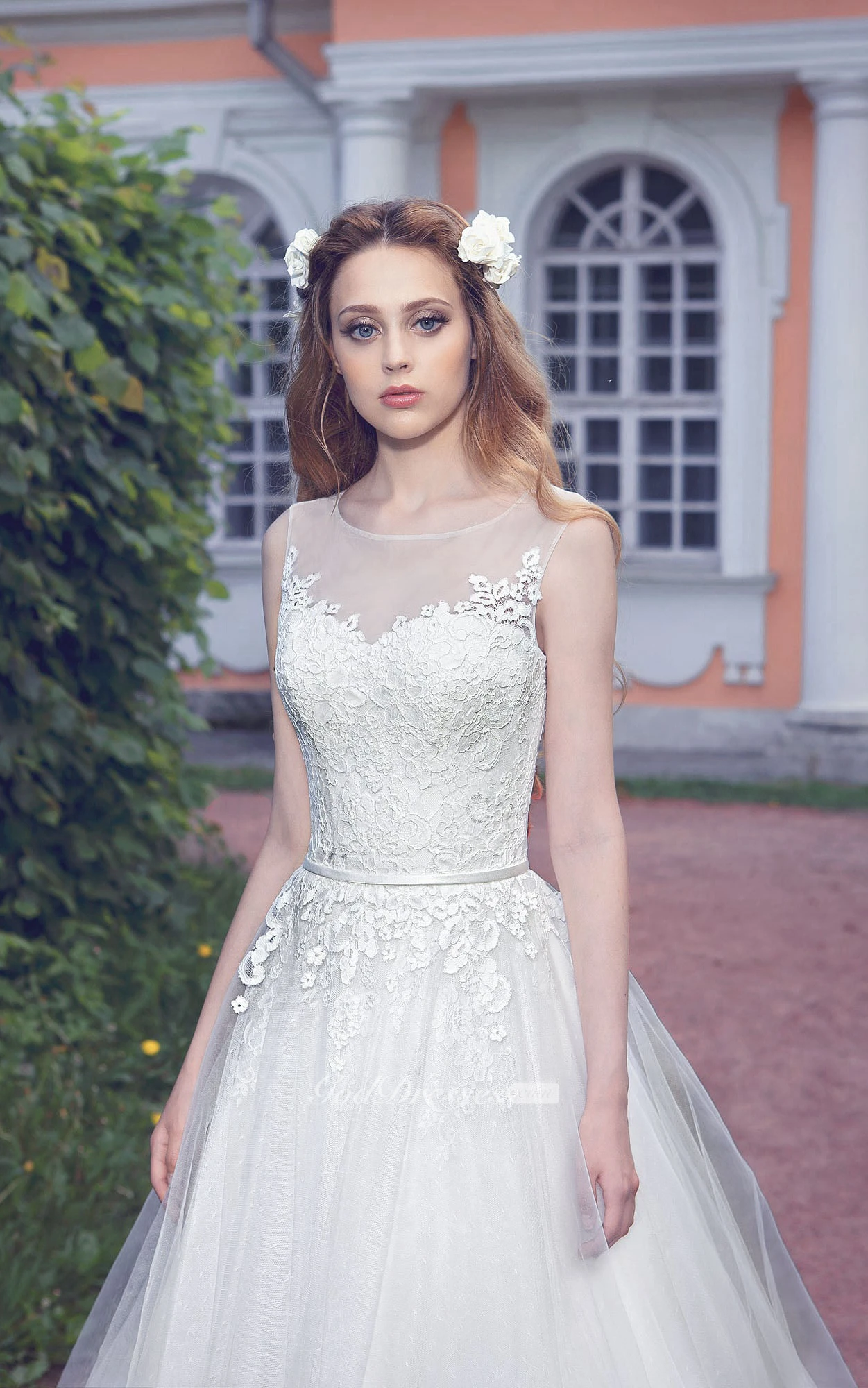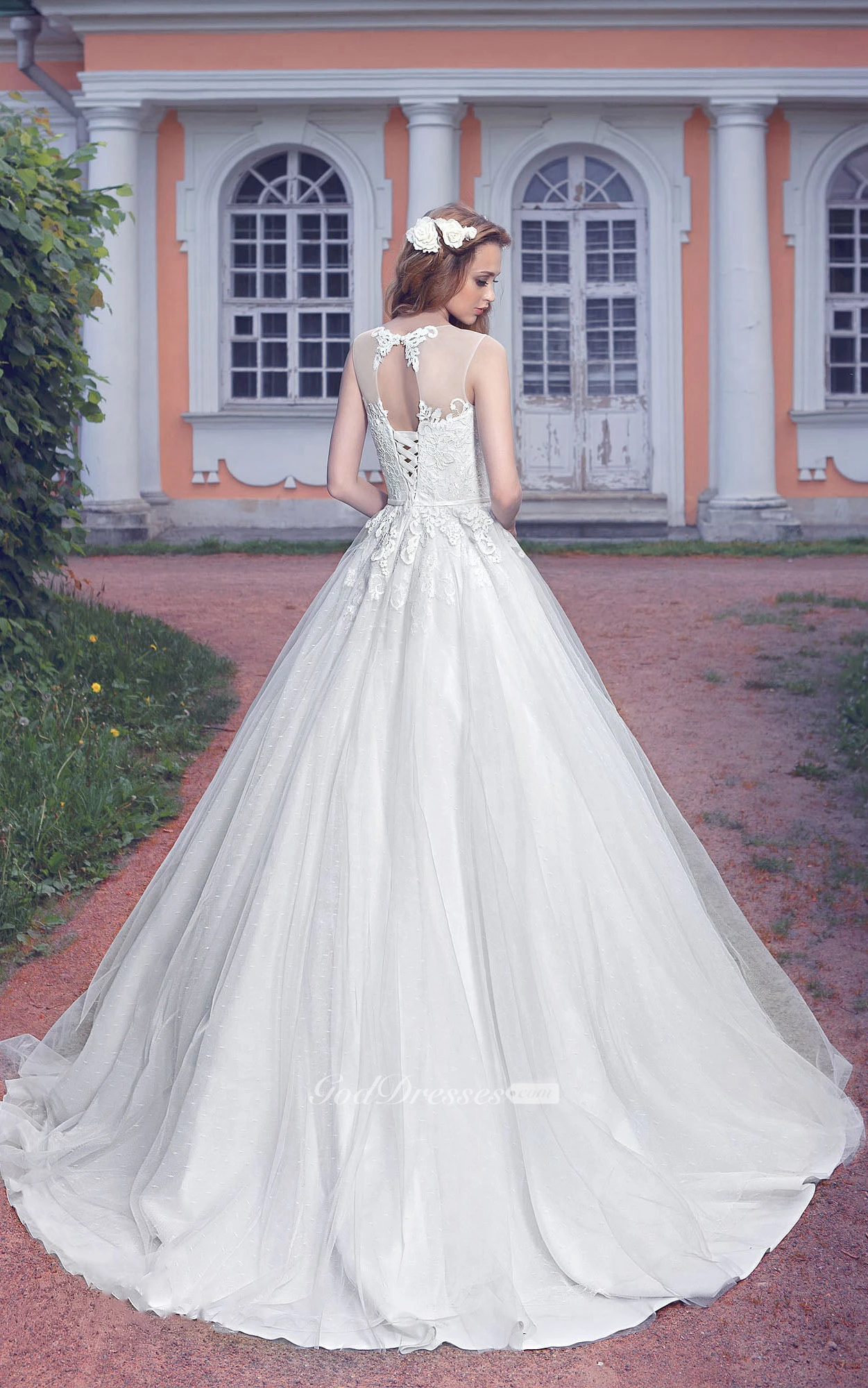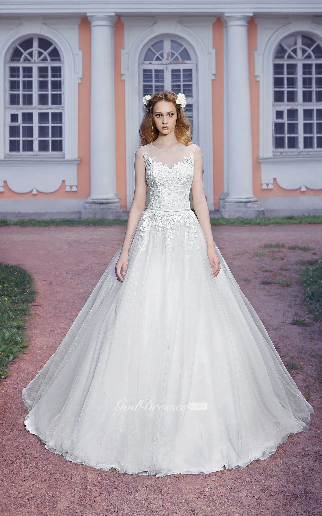 Ball Gown Floor-Length Scoop-Neck Sleeveless Keyhole Tulle Dress With Appliques