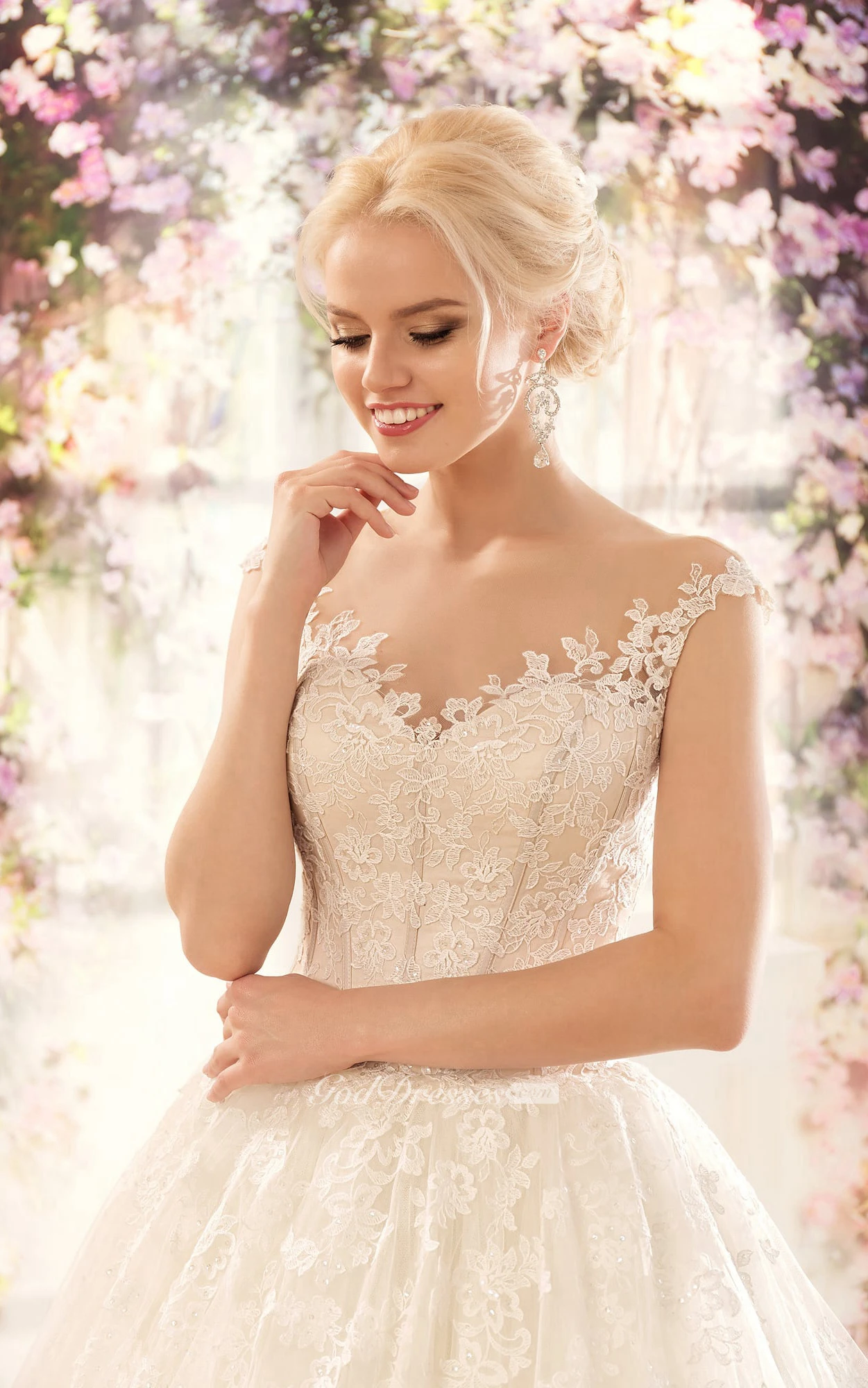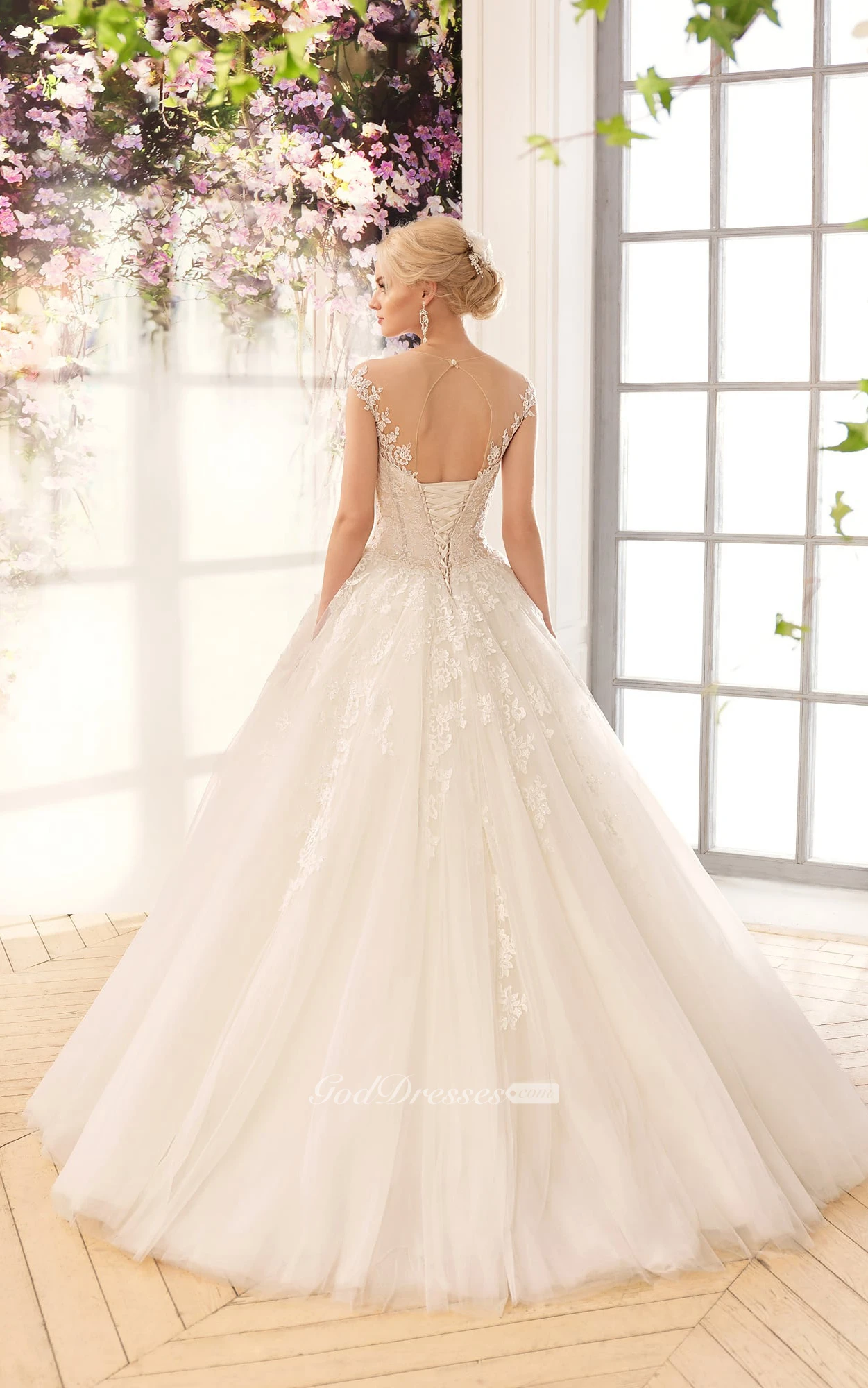 Ball Gown Floor-Length V-Neck Cap-Sleeve Corset-Back Lace Dress With Appliques