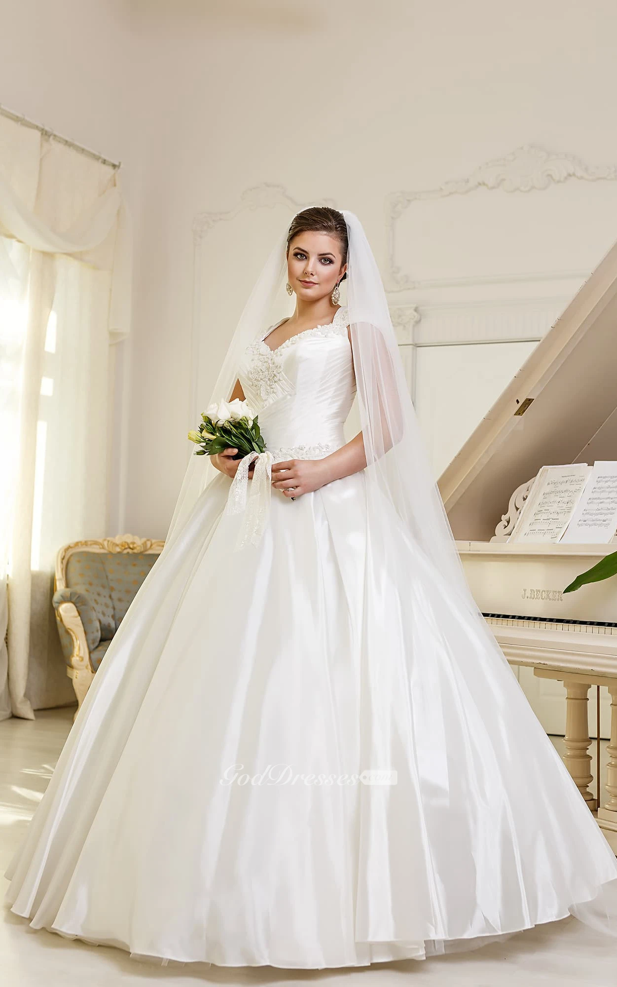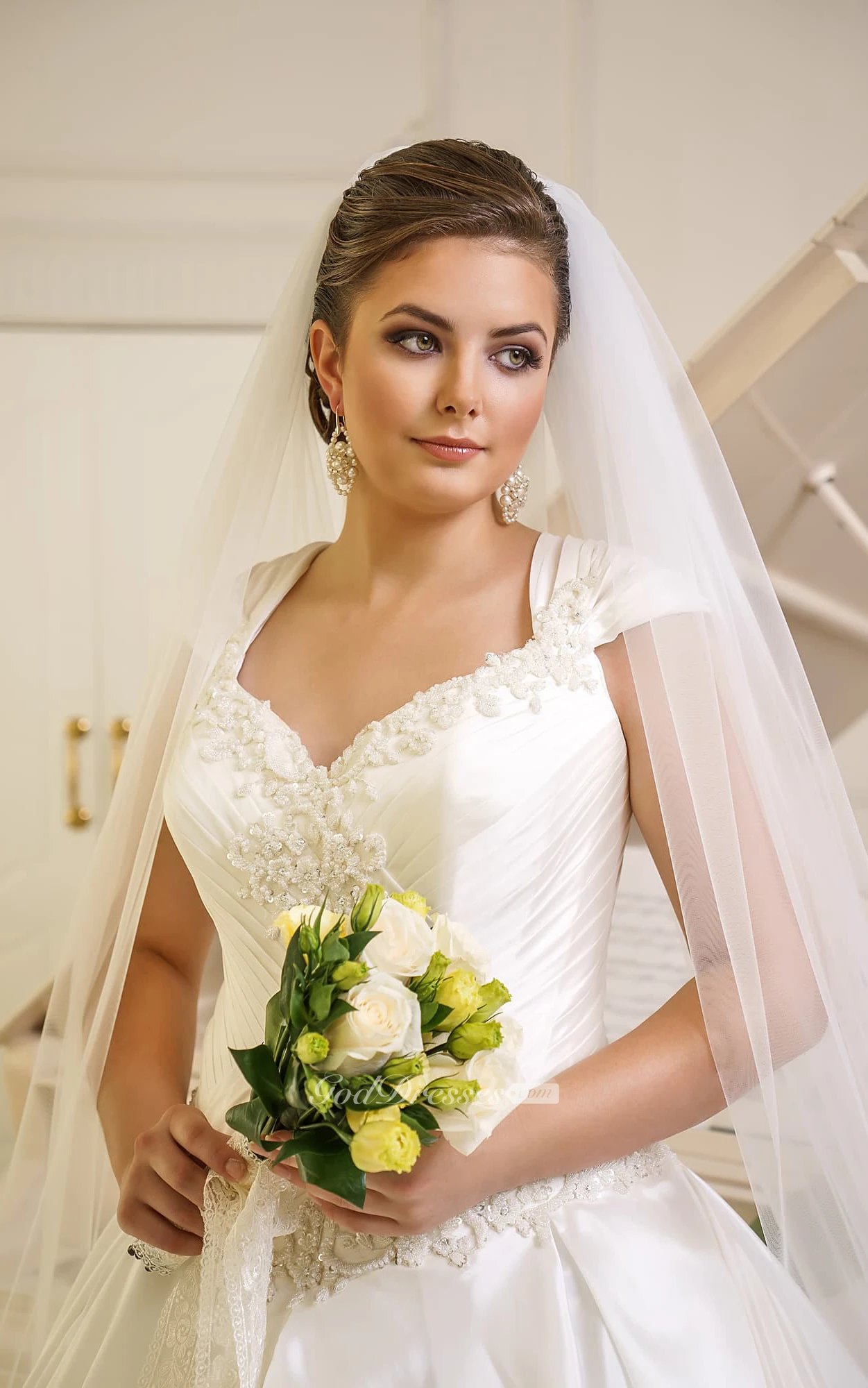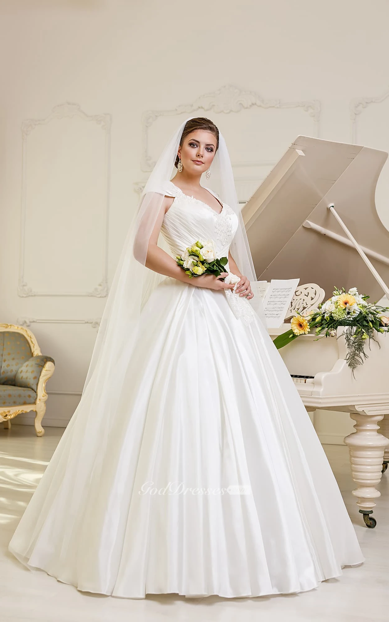 Ball Gown Floor-Length V-Neck Cap-Sleeve Corset-Back Satin Dress With Ruching And Appliques