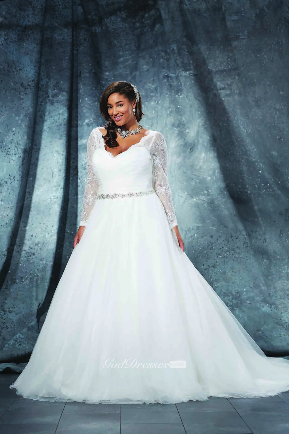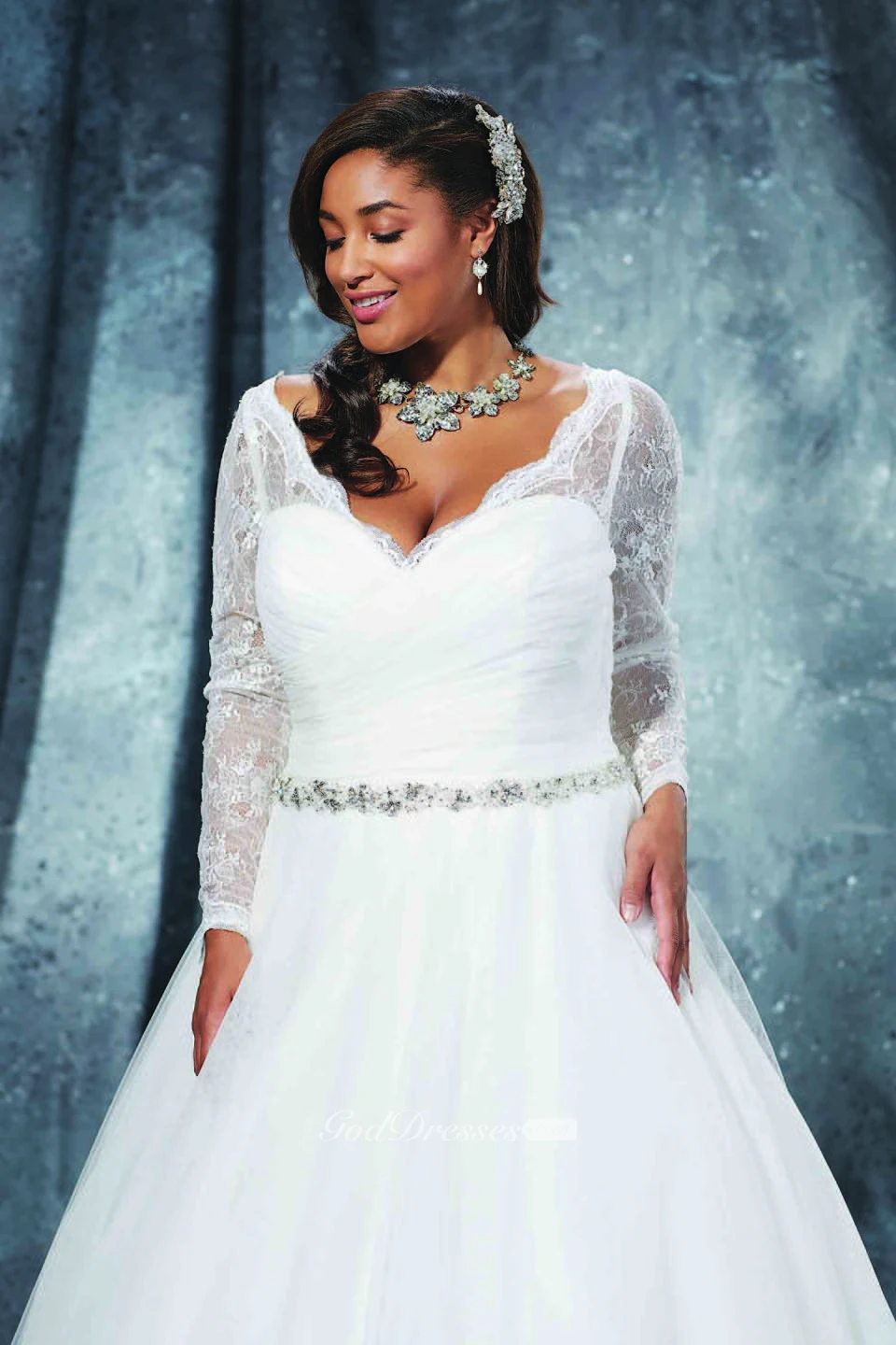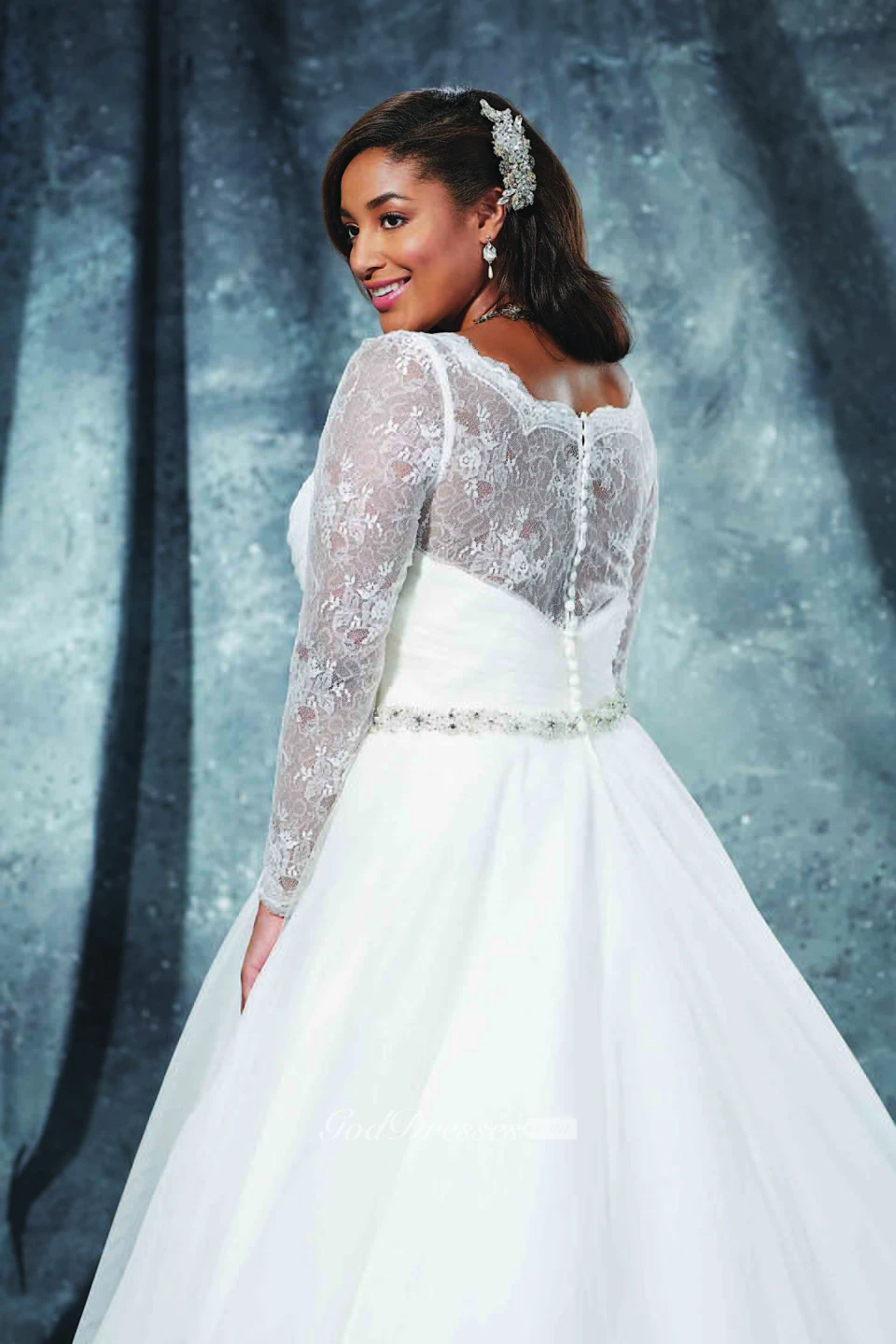 Ball Gown Floor-Length V-Neck Long Sleeve Tulle Criss Cross Waist Jewellery Court Train Illusion Criss cross Dress