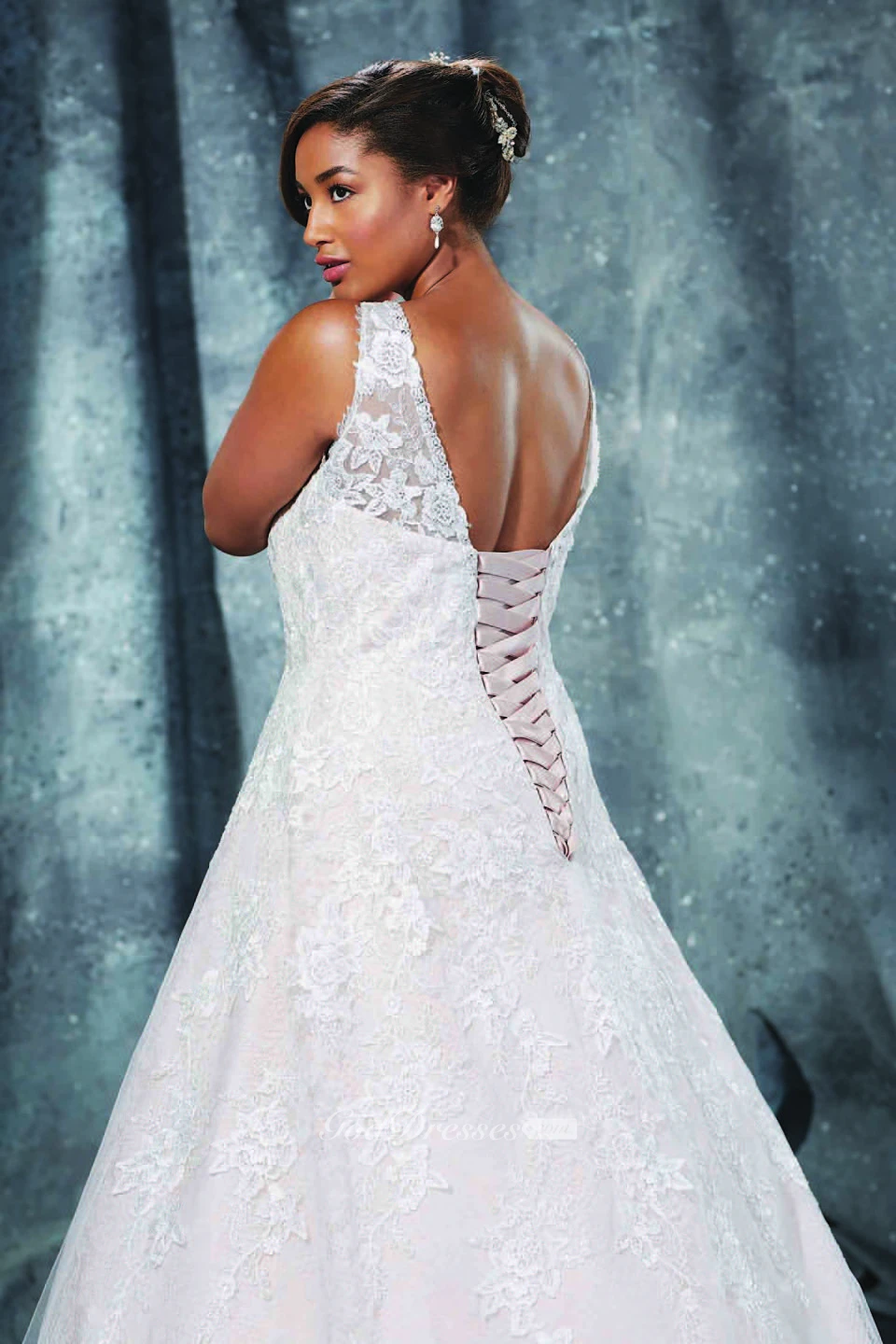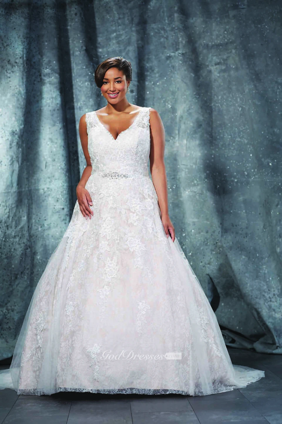 Ball Gown Floor-Length V-Neck Sleeveless Lace Sweep Train Lace-Up Back Appliques Dress