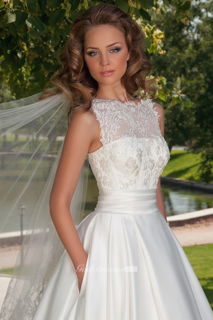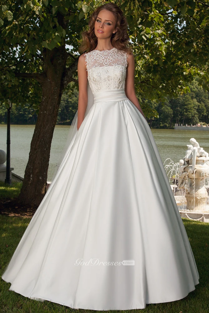 Ball-Gown Lace Jewel Sleeveless Floor-Length Satin Wedding Dress With Lace-Up Back And Bow