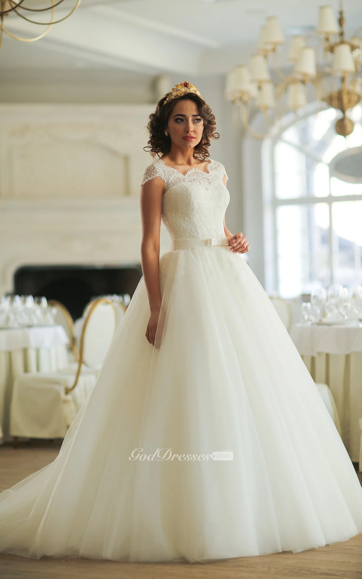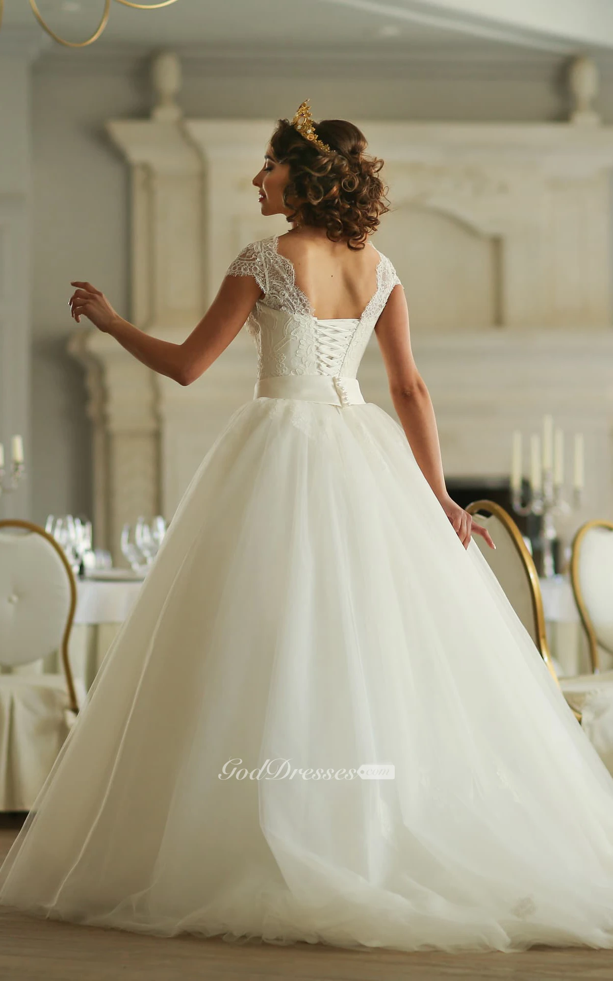Ball Gown Long Bateau Cap-Sleeve Lace-Up Tulle Dress With Lace