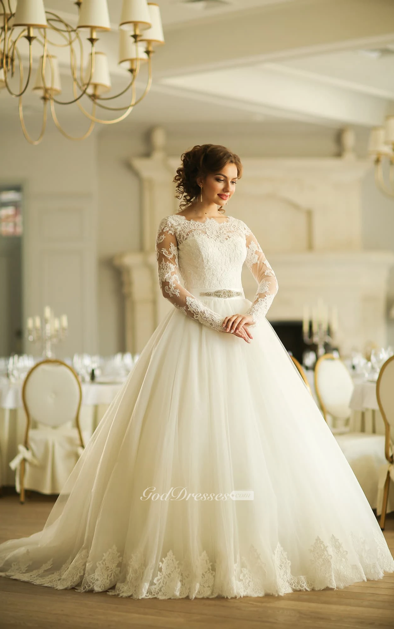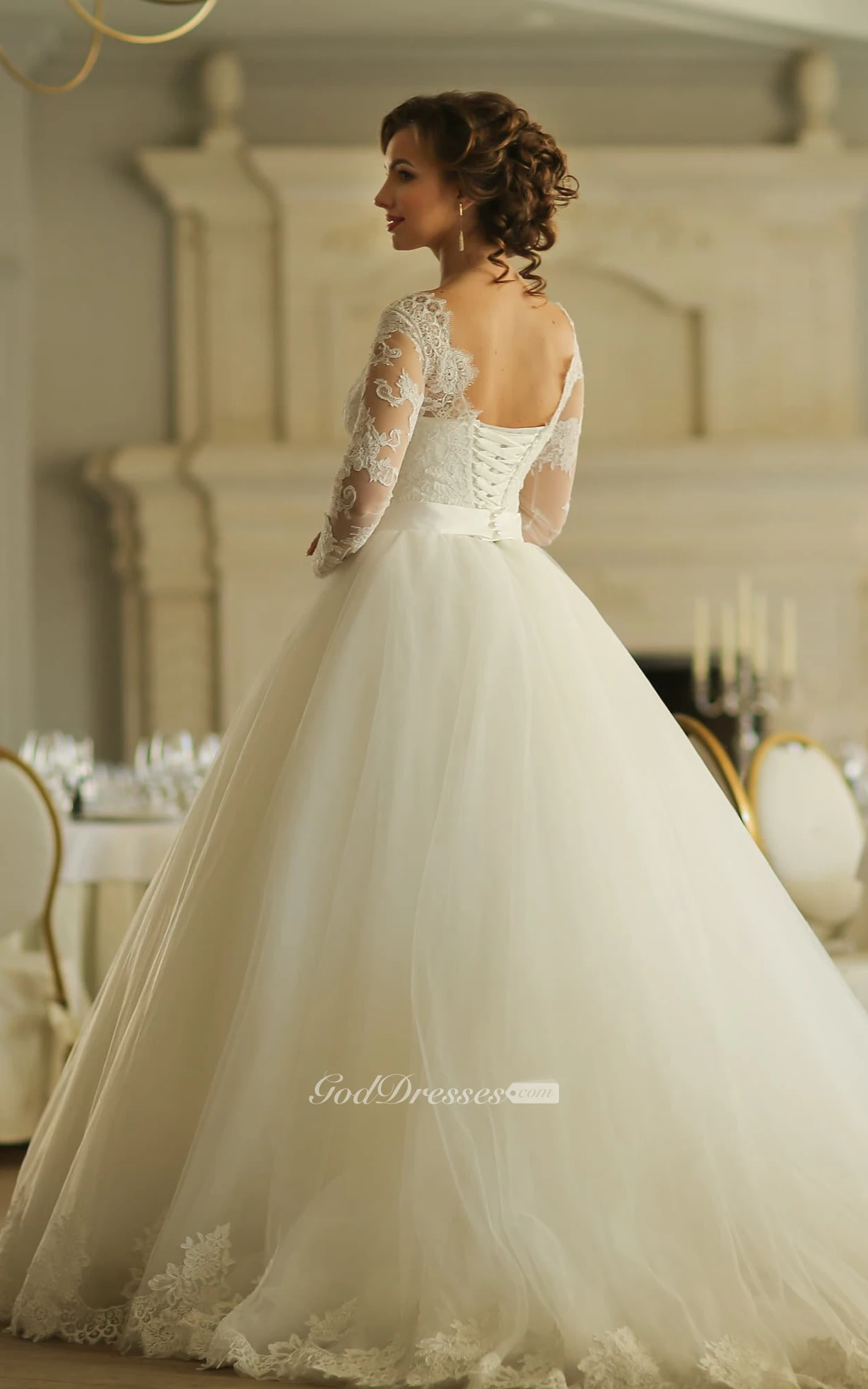 Ball Gown Long Bateau Long-Sleeve Corset-Back Tulle Dress With Appliques And Waist Jewellery
