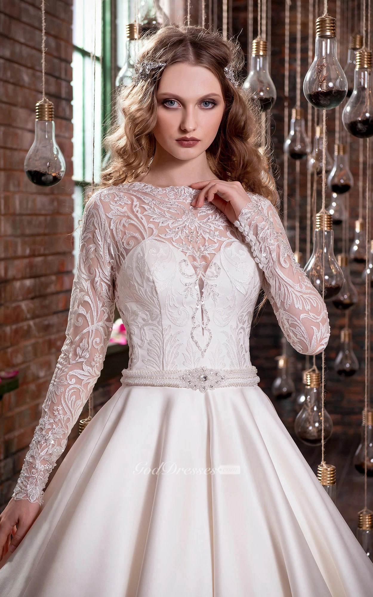 Ball Gown Long Jewel Long-Sleeve Illusion Satin Dress With Appliques And Waist Jewellery