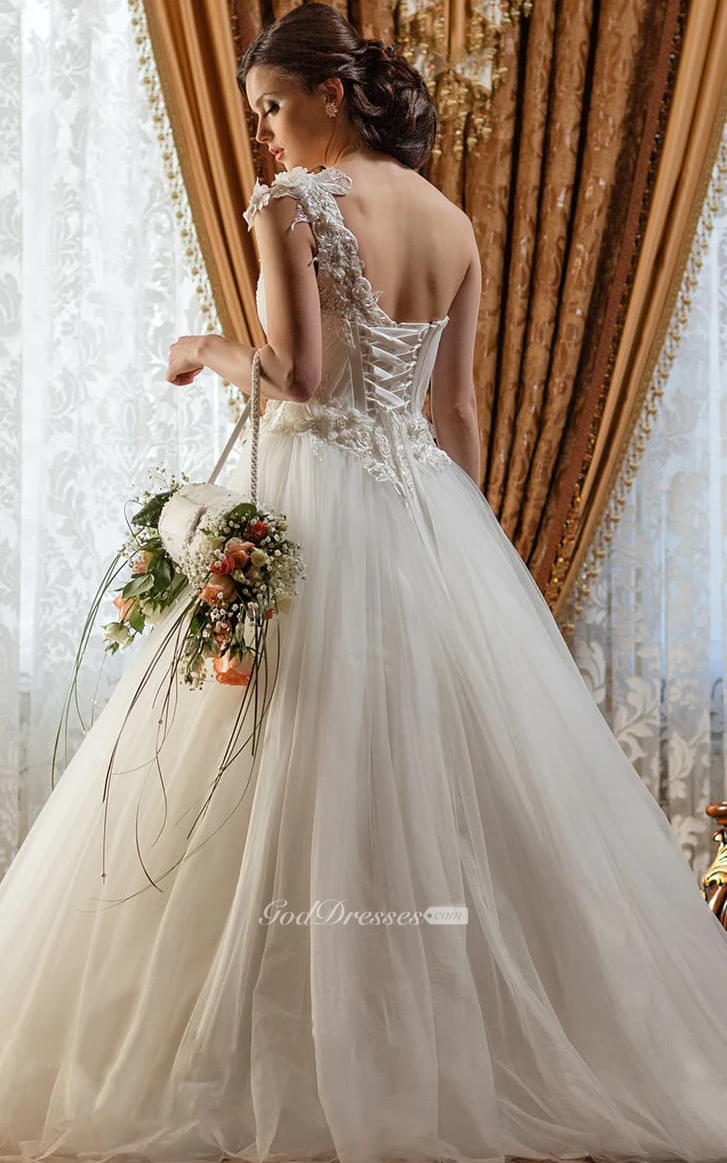 Ball Gown Long One-Shoulder Sleeveless Lace-Up Tulle Dress With Flower And Ruching
