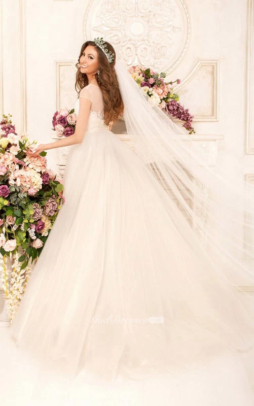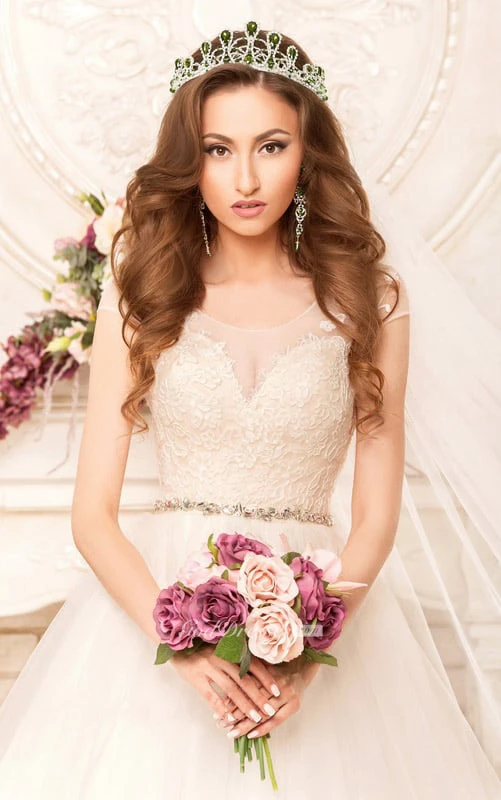Ball Gown Long Scoop Sleeveless Illusion Tulle Lace Dress With Appliques And Waist Jewellery
