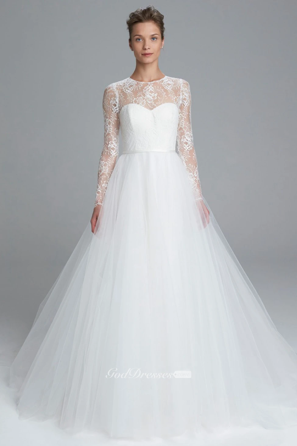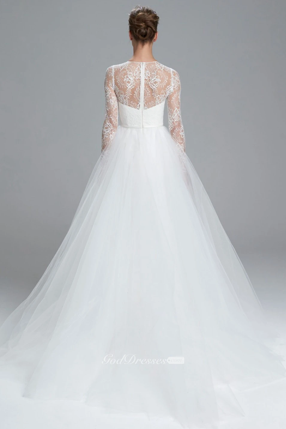 Ball Gown Long-Sleeve High Neck Tulle Wedding Dress With Lace And Illusion