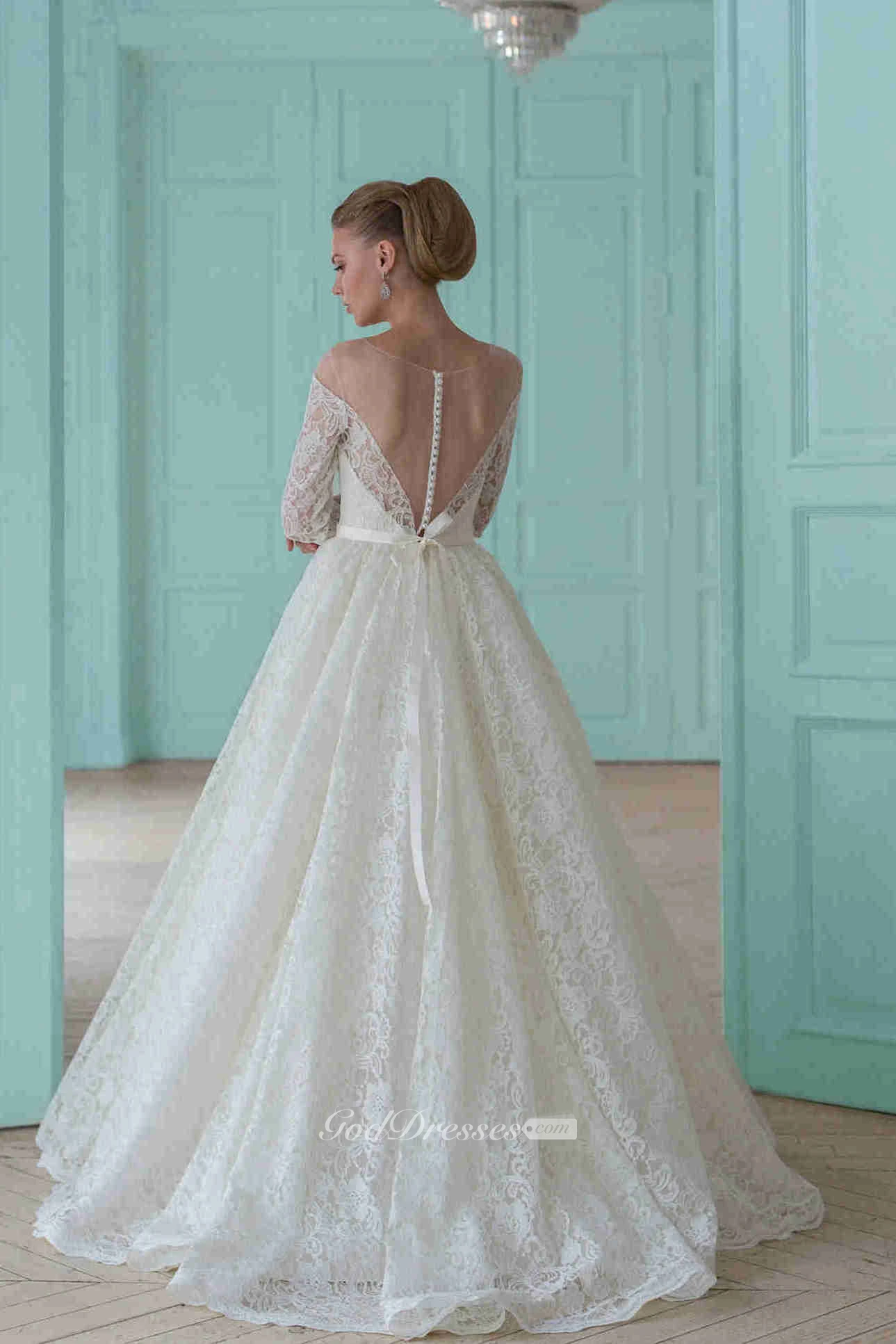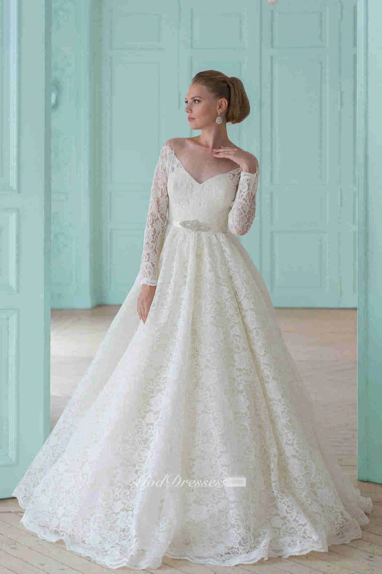 Ball Gown Long-Sleeve Scoop-Neck Lace Wedding Dress With Waist Jewellery And Illusion