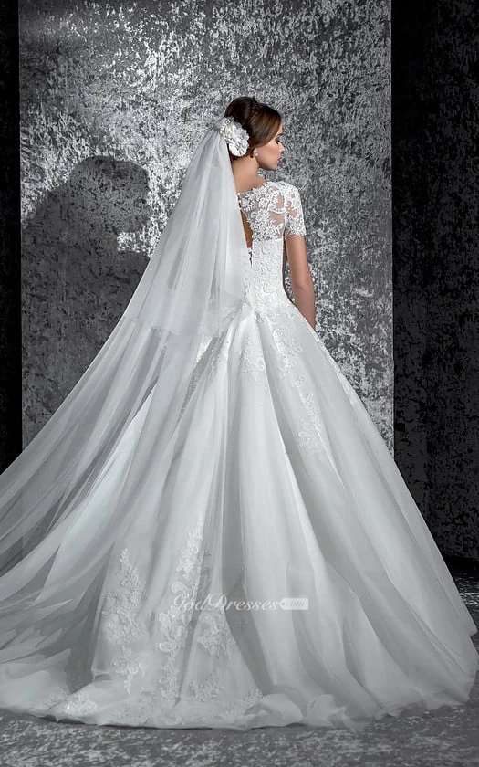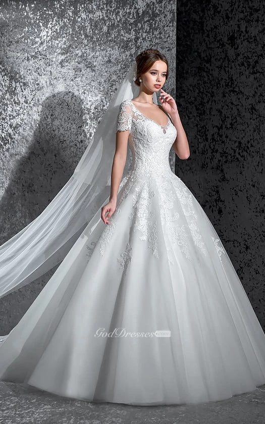Ball Gown Long V-Neck Short-Sleeve Keyhole Lace Dress With Appliques