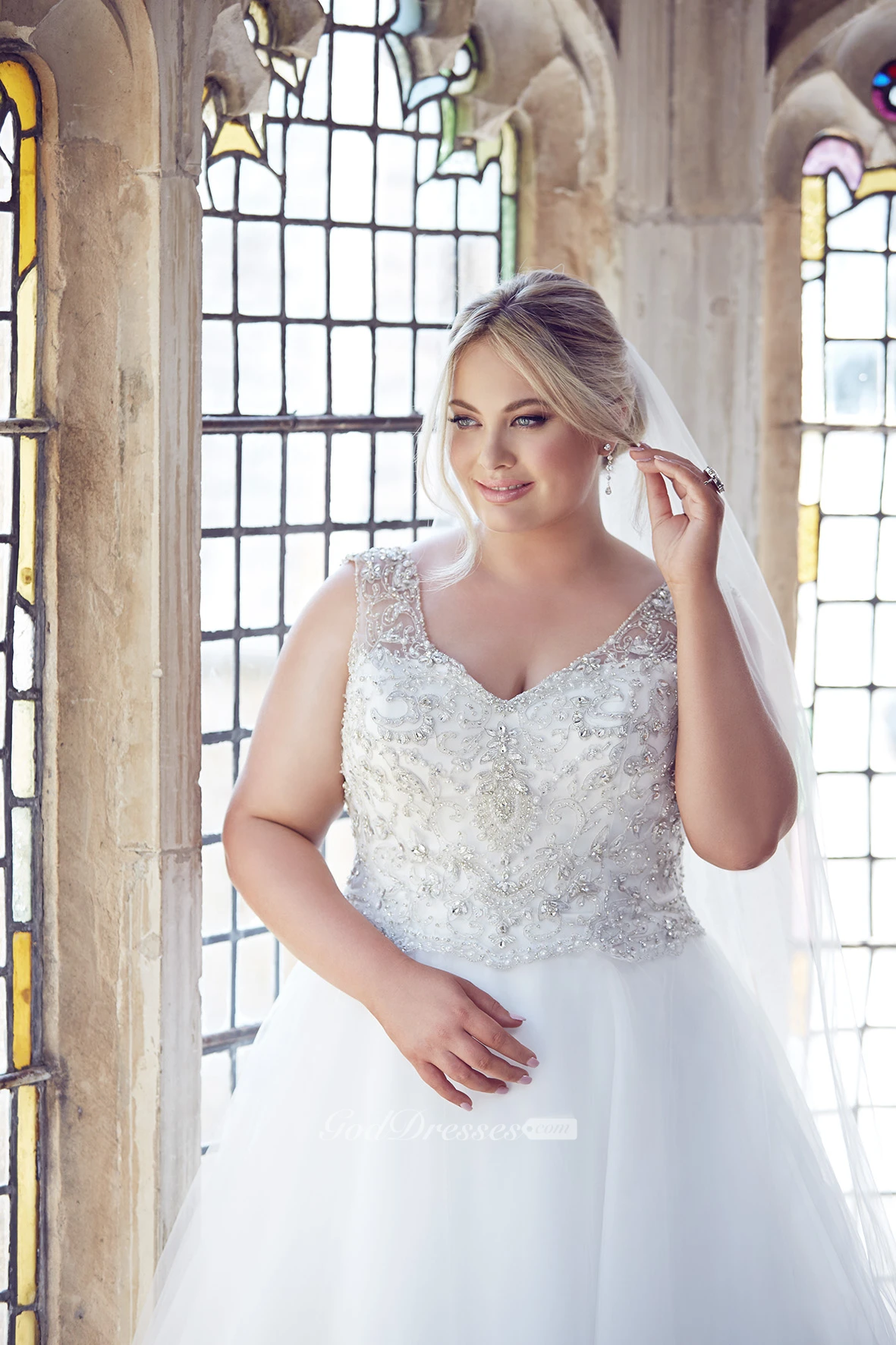 Ball Gown Long V-Neck Sleeveless Tulle Plus Size Wedding Dress With Beading