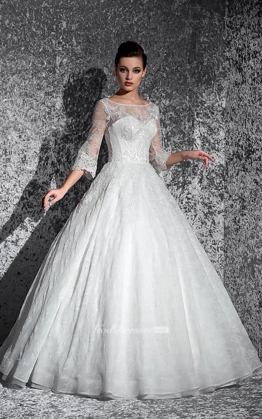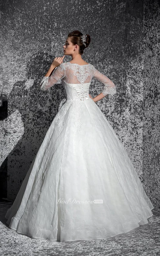Ball Gown Maxi Bateau Puff-Sleeve Illusion Lace Dress With Appliques