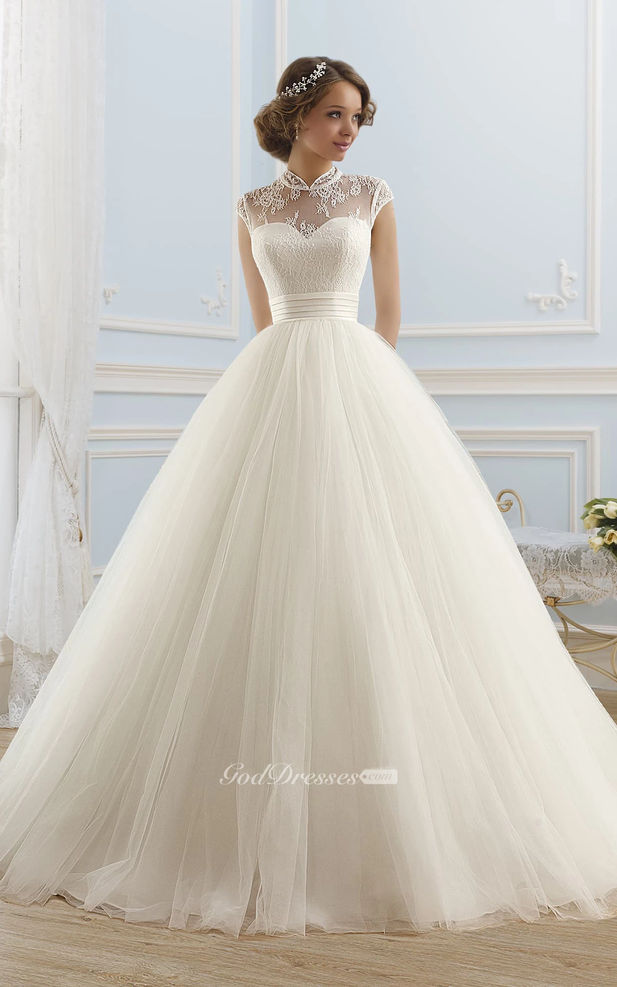 Ball Gown Maxi High-Neck Sleeveless Illusion Satin Dress With Lace