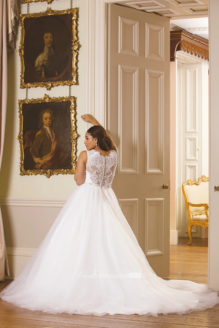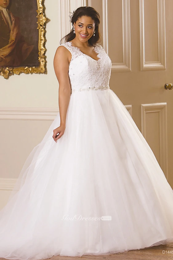 Ball Gown Maxi Sleeveless V-Neck Jeweled Tulle Plus Size Wedding Dress With Appliques And Illusion