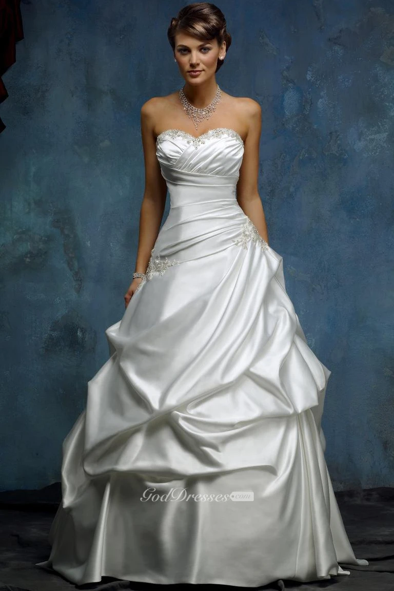 Ball Gown Sweetheart Pick-Up Floor-Length Satin Wedding Dress With Criss Cross And Beading