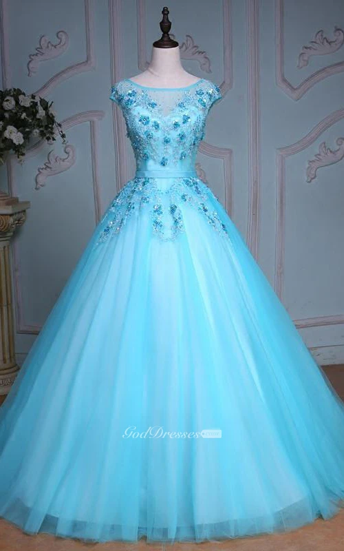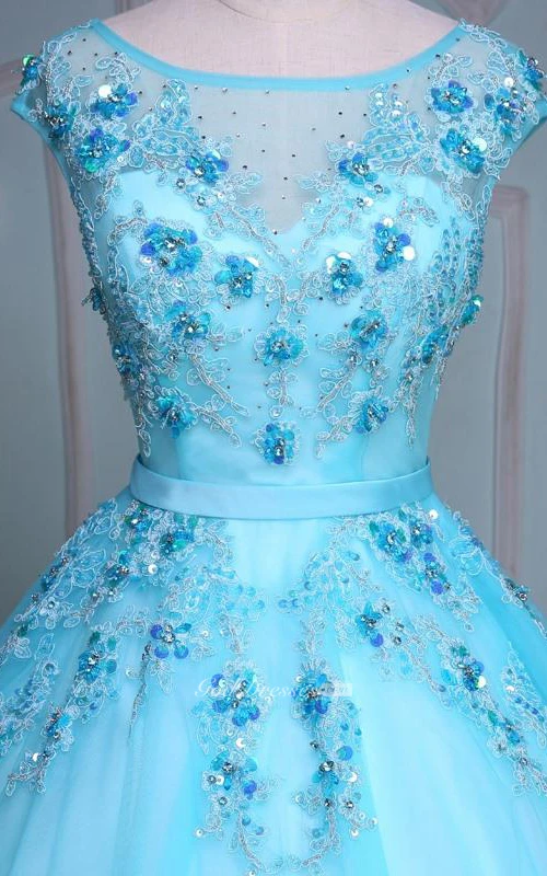 Ball Gown Tea-Length Bell Cap Bat Beading Appliques Court Train Corset Back Tulle Lace Sequins Dress