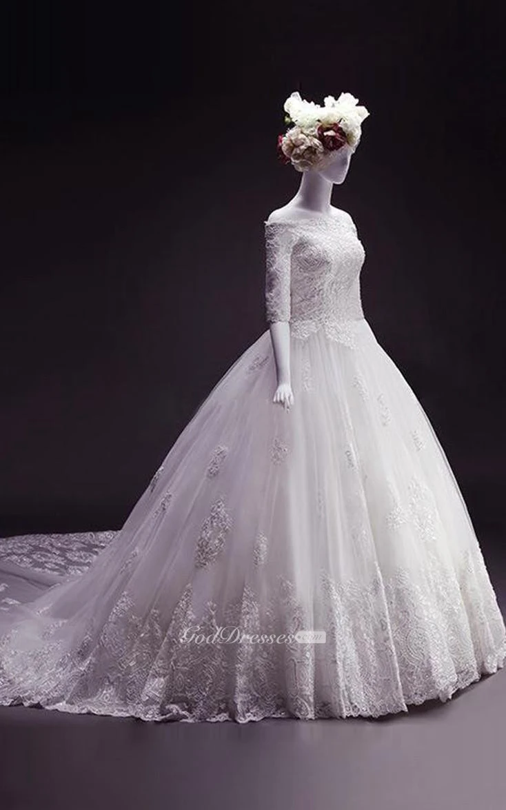Ball Gown Tea-Length Off-The-Shoulder Half Sleeve Appliques Court Train Lace Dress
